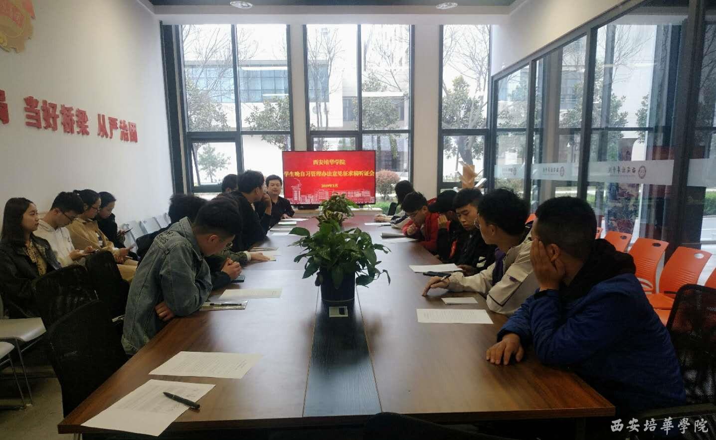 3月27日下午,《西安培华学院学生晚自习管理办法意见(征求稿)》(后称管理办法)听证会,在恒友楼(北口)一层团委会议室举行。学生服务中心思政部老师薛晗光、张姣及学生代表共30余人参加了此次活动。