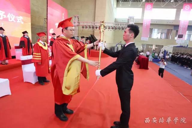 我校理事长姜波博士迎权杖,在本次毕业典礼中引入学术权杖在陕西省民办高校中尚属首次。我校学术权杖制作精致大气,权杖上端为皇冠、校名浮雕,杖身通体金色,象征着大学校园里最高的学术权力和知识的无上圣洁