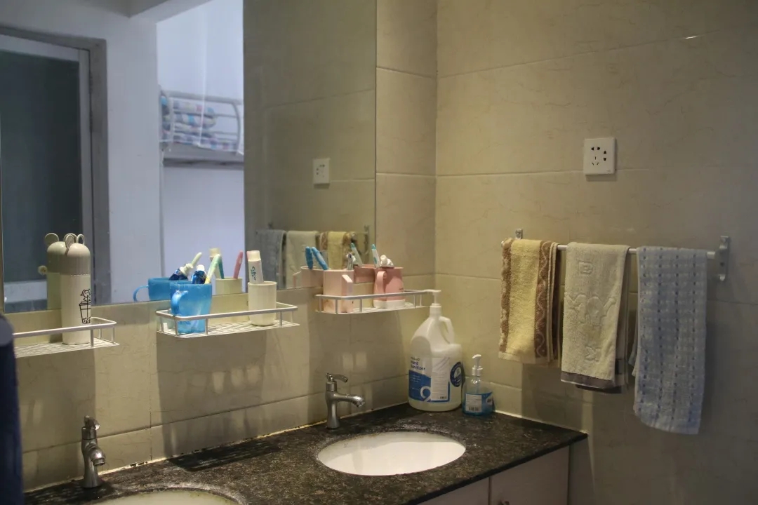 8、洗漱台:台面干净无积尘污渍,洗漱用品摆放整齐有序。暖瓶统一放置在台面两侧的下方,洗漱池内干净无污垢。