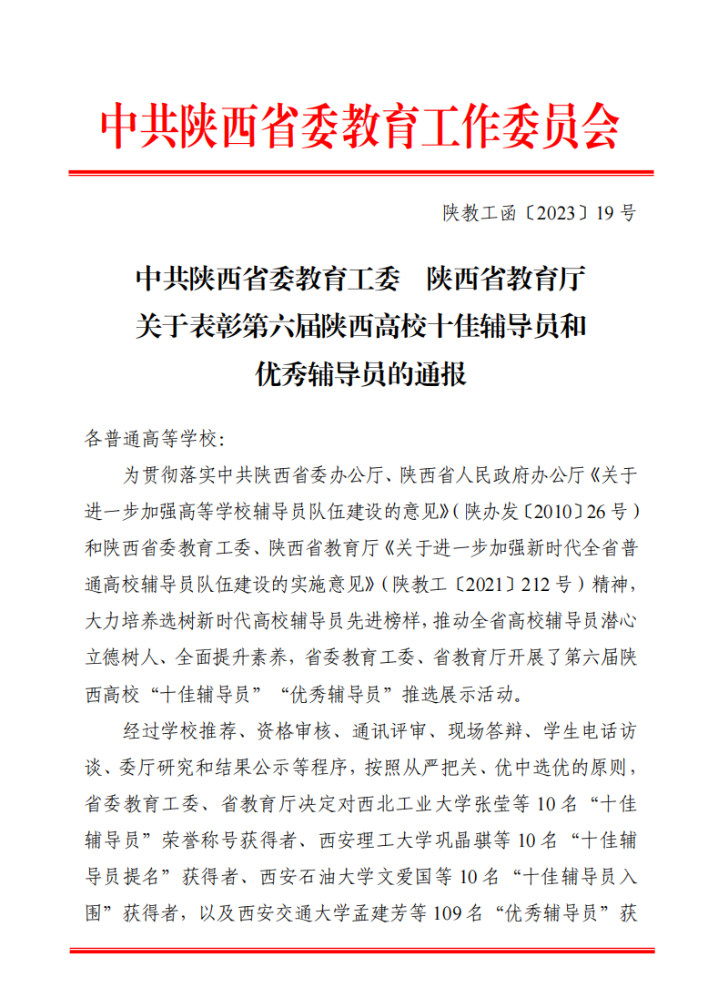 近日,“第六届陕西高校十佳辅导员和优秀辅导员推选展示”结果公布,我校推荐的三位老师全部获奖。传媒学院党委副书记、辅导员高嘉炜获得“陕西省十佳辅导员”荣誉称号,这也是陕西省民办高校首次获得该荣誉。智能科学与信息工程学院党总支副书记、辅导员王伟平,人文与国际教育学院辅导员冯豆菲获得“陕西省优秀辅导员”称号。