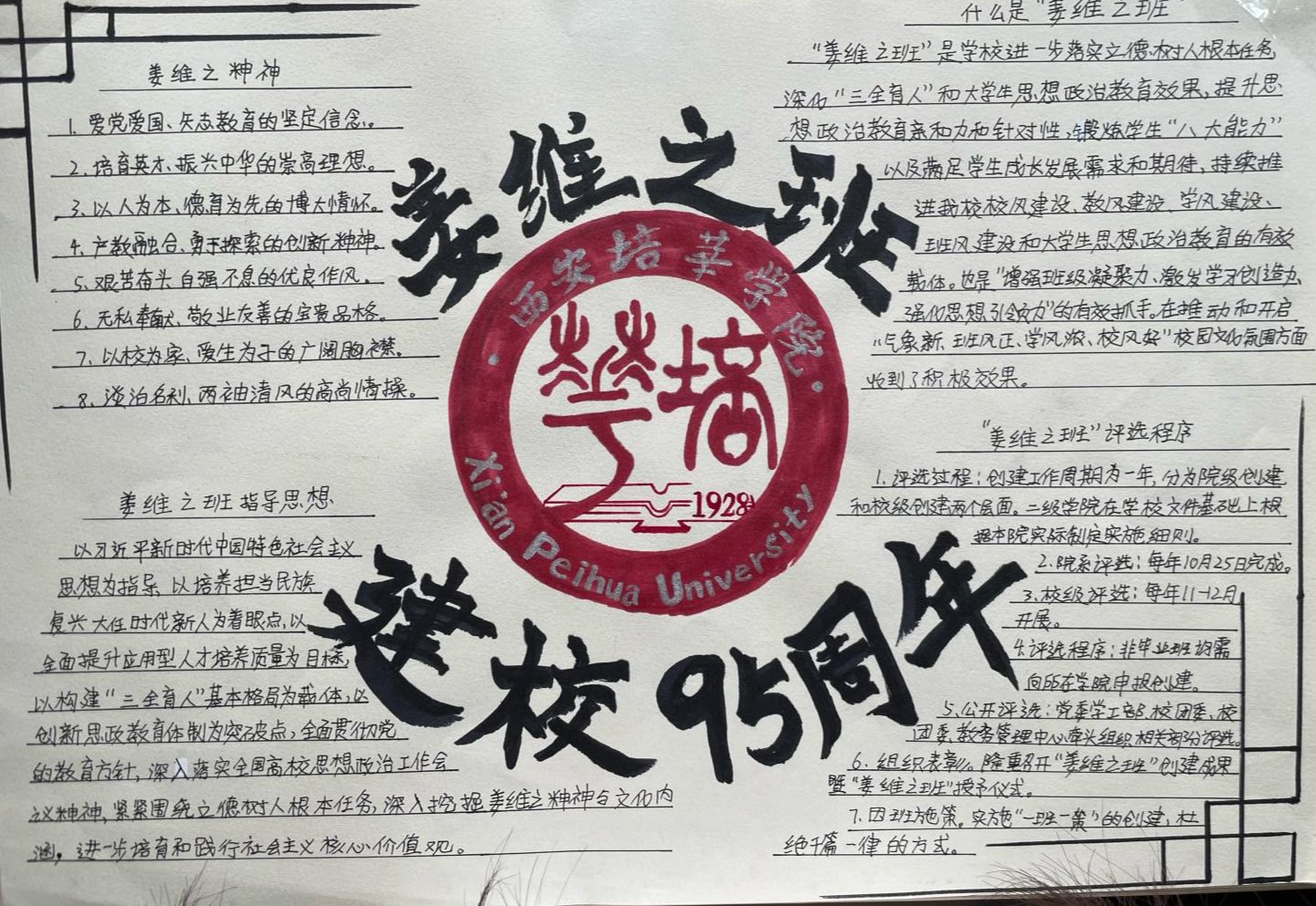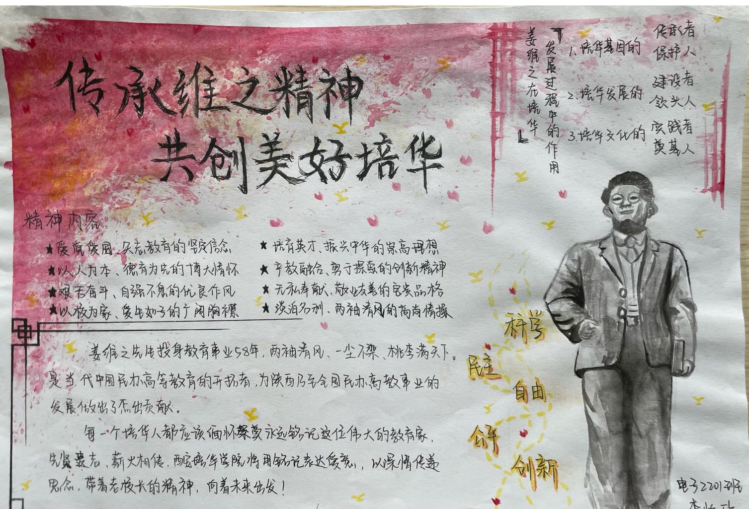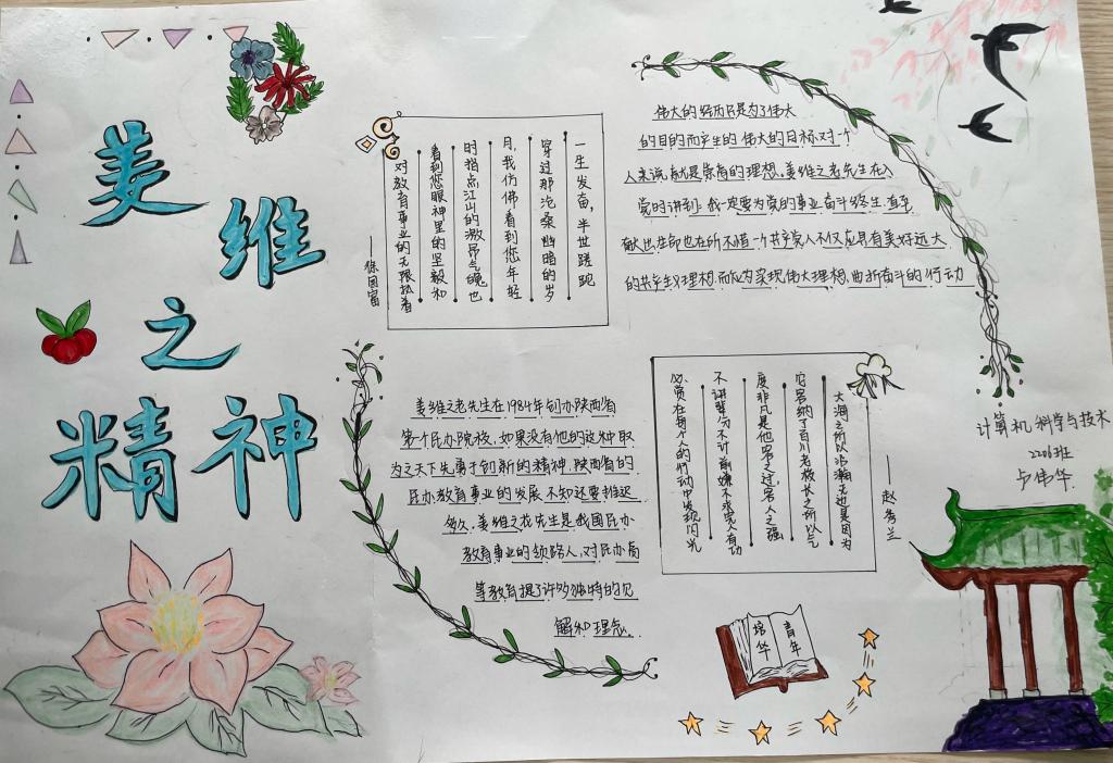 姜维之老校长一生忠于教育事业,严格践行“以人为本、以德为先”的办学理念,注重教育教学质量和学生综合素质,办人民满意的大学,赢得了政府和社会各界的一致好评。是当代中国民办高等教育的开拓者,为陕西乃至全国民办高教事业的发展做出了杰出贡献。“姜维之班”的创建,是一种精神的传承,是我们每一位培华师生的力量源泉。不同的手抄报从各个维度、各个层面很好的诠释了姜维之精神的内涵,充分展示了智信青年对创建“姜维之班”的热情和积极性,具有很强的学习意义和宣传价值。也为我们深入了解维之精神、践行维之精神提供了更好的渠道。