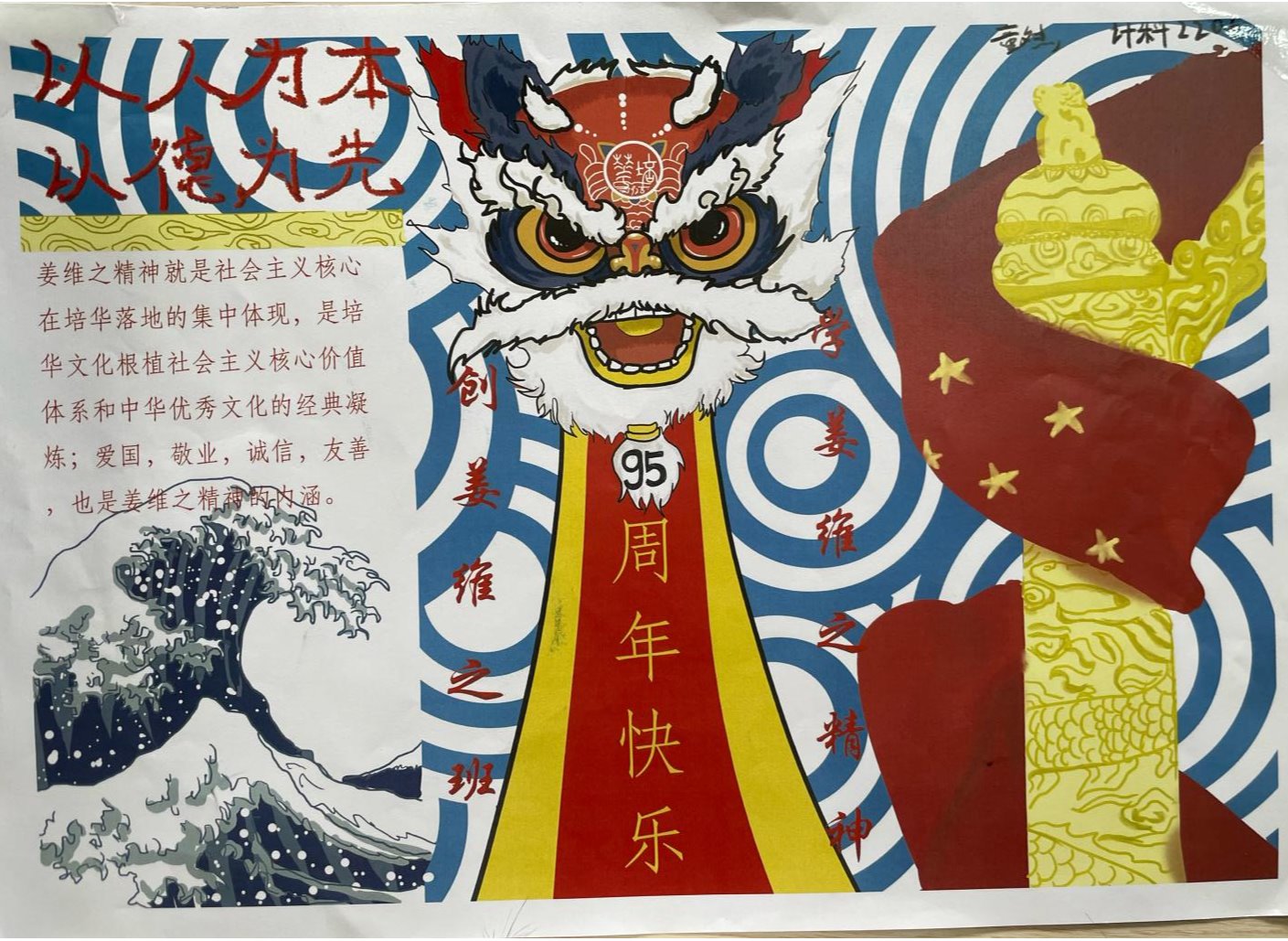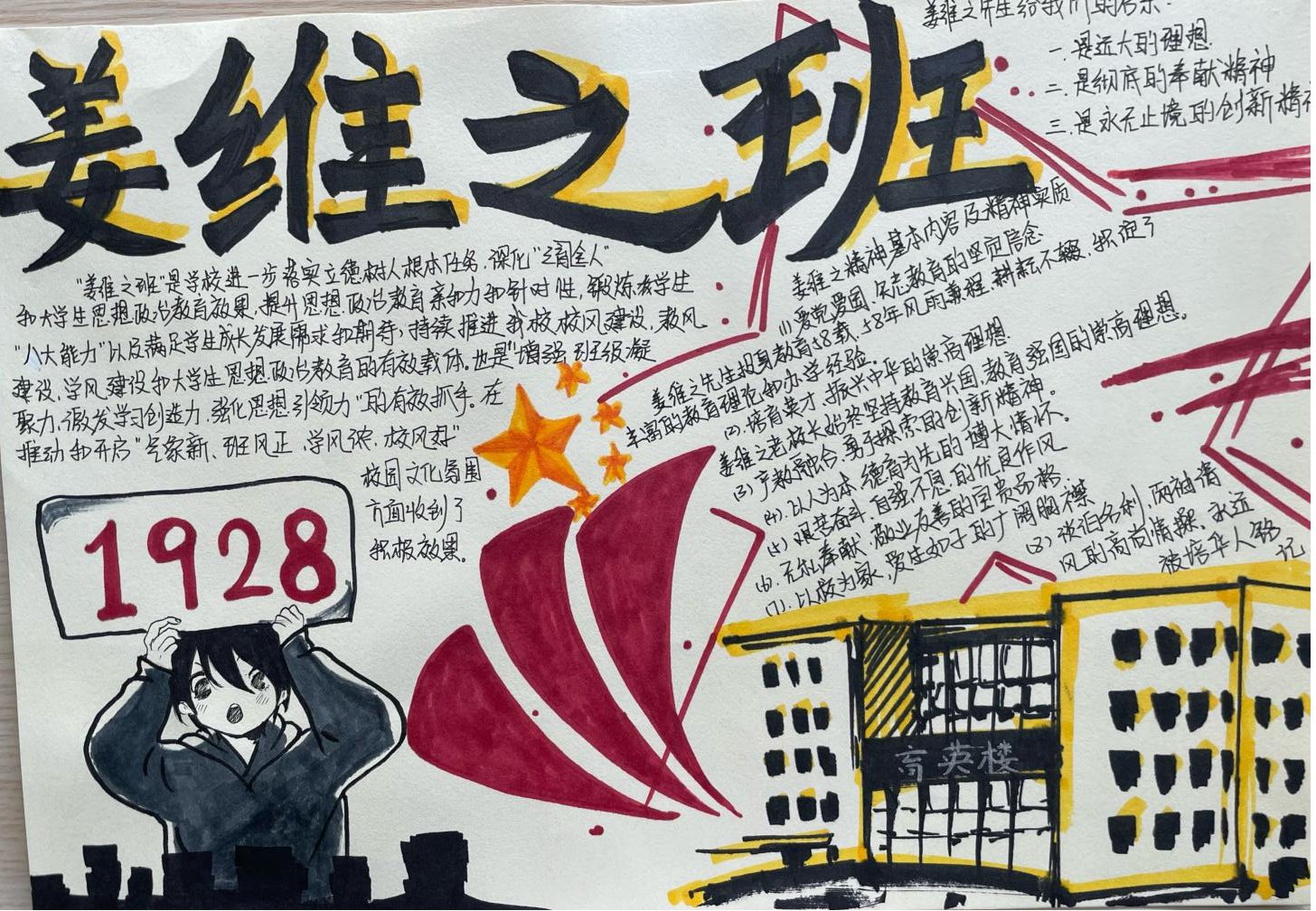 为进一步落实立德树人根本任务,加强我院学风建设,推进“姜维之班”创建深入开展,增强班级凝聚力,激励智信学子继承和发扬姜维之先生的精神,我院以班级为单位,号召同学通过绘制手抄报的形式,展示自己对于姜维之班和姜维之精神的理解。本次姜维之班手抄报优秀作品在我院育英楼东门前进行展示。
