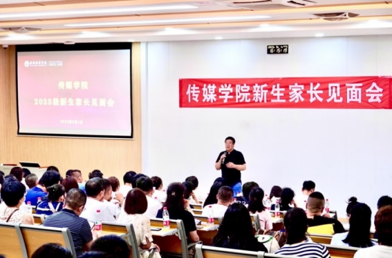 传媒学院院长杜耀峰教授代表学院师生向新生家长致辞,对家长和学生选择我校表示热烈欢迎和感谢,并向家长详细介绍了学院独特的优势、专业特色、师资力量和教育理念。同时对新生的成长提出三点希望:一要做有大爱的人,爱人、爱家、爱国;二要做有大德的人,崇德、明德、修德;三要做有大情怀的人,有大视野、大格局、大担当。党委书记江俊瑞表示学院组织见面会的目的就是加强家校的沟通和交流,协助家长和学生加强对学院的认知,充分的了解学院、信任学院和选择学院,学院也将继续加强对学生的认识和了解,奠定因材施教的培养基础。