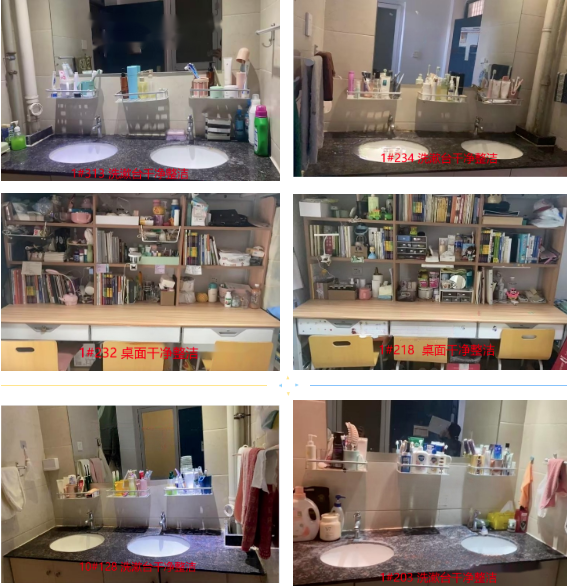 (3)无卫生脏乱差。地面干净,无垃圾、无积水,阳台、卫生间无污垢,无杂物堆放;墙面干净,墙面无损坏、无涂鸦;门窗干净,无污迹,室内玻璃擦拭干净,窗框无积尘;桌面、床面干净,物品摆放整齐,桌面、电脑键盘、机箱等干净无积灰;室内设施设备干净,无积灰、无损坏;讲究个人卫生,着装整洁、个人物品及时整理、清洗,保持干净。