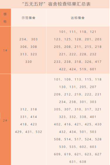 本次检查评比工作,是在各学生社区自查整改基础上开展的,总计1302间宿舍,其中“五无五好”示范宿舍208间,达标宿舍956间,不达标宿舍138间。现将本次检查的结果进行公示: