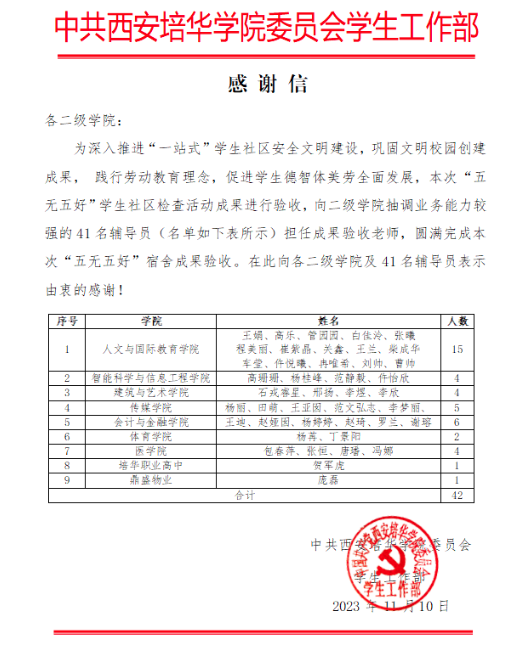 向支持与配合开展“五无五好”宿舍检查工作的各二级学院与辅导员们表示由衷地感谢。同时,各二级学院对检查中发现的问题给予高度重视,加强“一站式”学生社区的安全建设,共同营造良好的学生社区住宿环境。