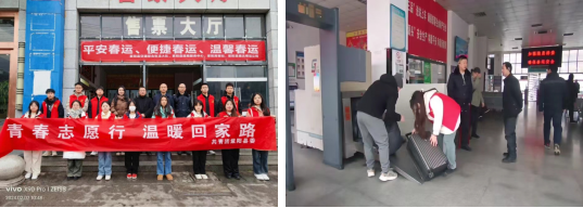 游世梅 同学在2024年2月2日至2月8日在陕西省安康市紫阳县团县委单位开展了“返家乡”(五育并举)活动,具体内容为:在紫阳县高科站车站广场,进出站口,售票口,候车大厅等地方,为旅客们提供引导咨询,秩序维护、网络购票、行李搬运等志愿服务工作。