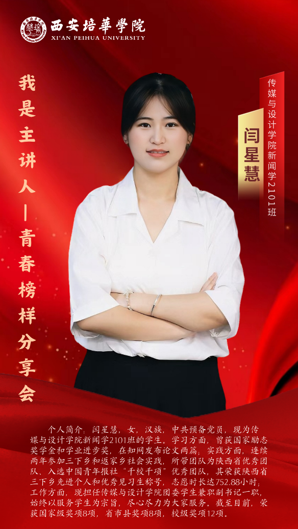为进一步加强学风建设和文明行为养成教育,创建优良学风,树典型、立标杆、重帮扶,学习发展中心特举办“心有榜样 行有力量”之青春榜样经验分享会系列活动;充分发挥朋辈“树旗、导航、激励、互助”作用,汇聚榜样引领力量,聚焦学业发展规划和学习生活经验分享,3月28日晚上19:00-20:00,“心有榜样,行有力量”之青春榜样分享会第二期如期而至。本次分享会邀请到三位优秀培华学子,他们分别是大学生社区工作委员会主席桑巍、传媒与设计学院团委学生兼职副书记闫星慧、西安培华学院国旗护卫队团支部书记陈慧;他们分别从学业、社会实践、学生工作等各方面进行汇报分享。