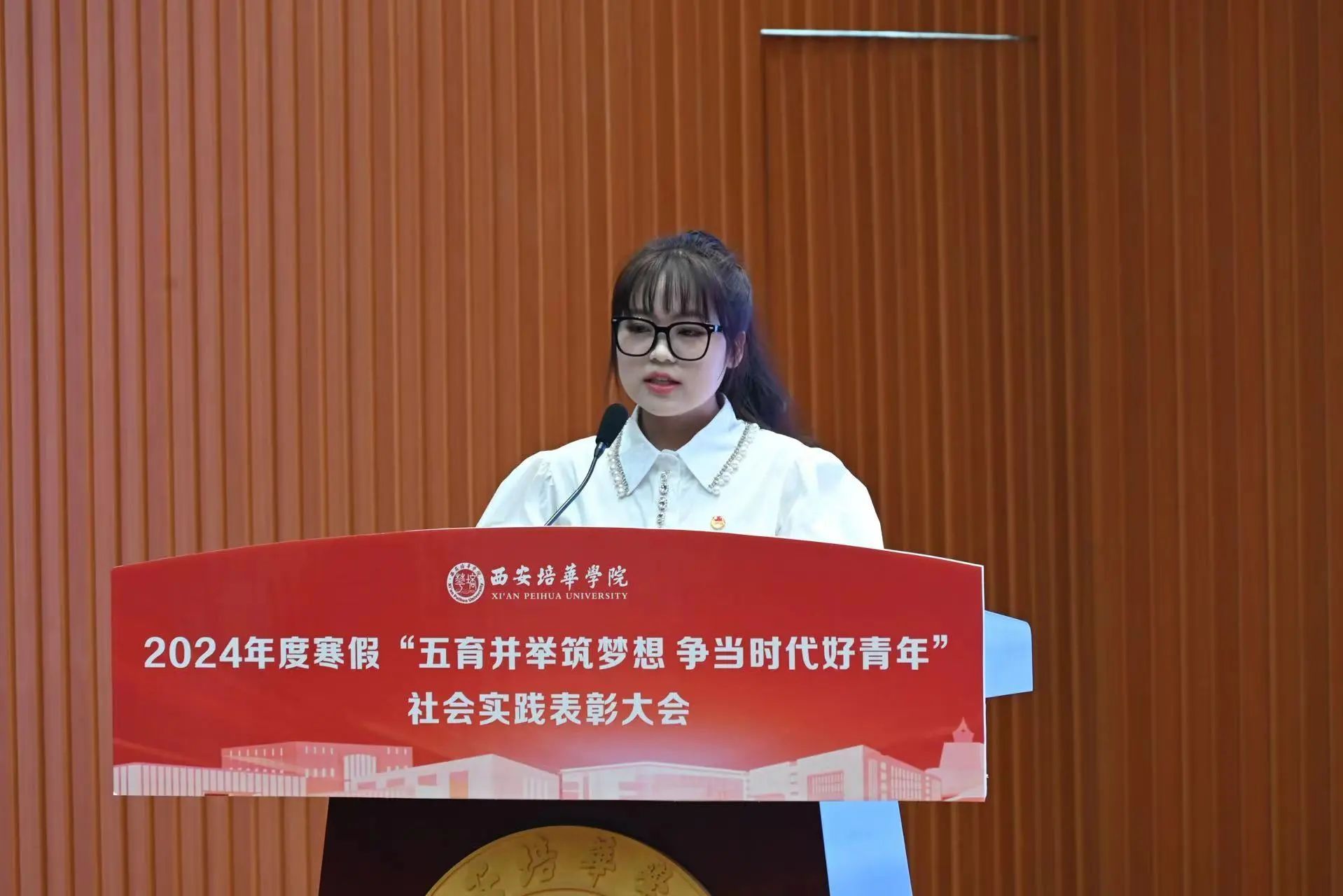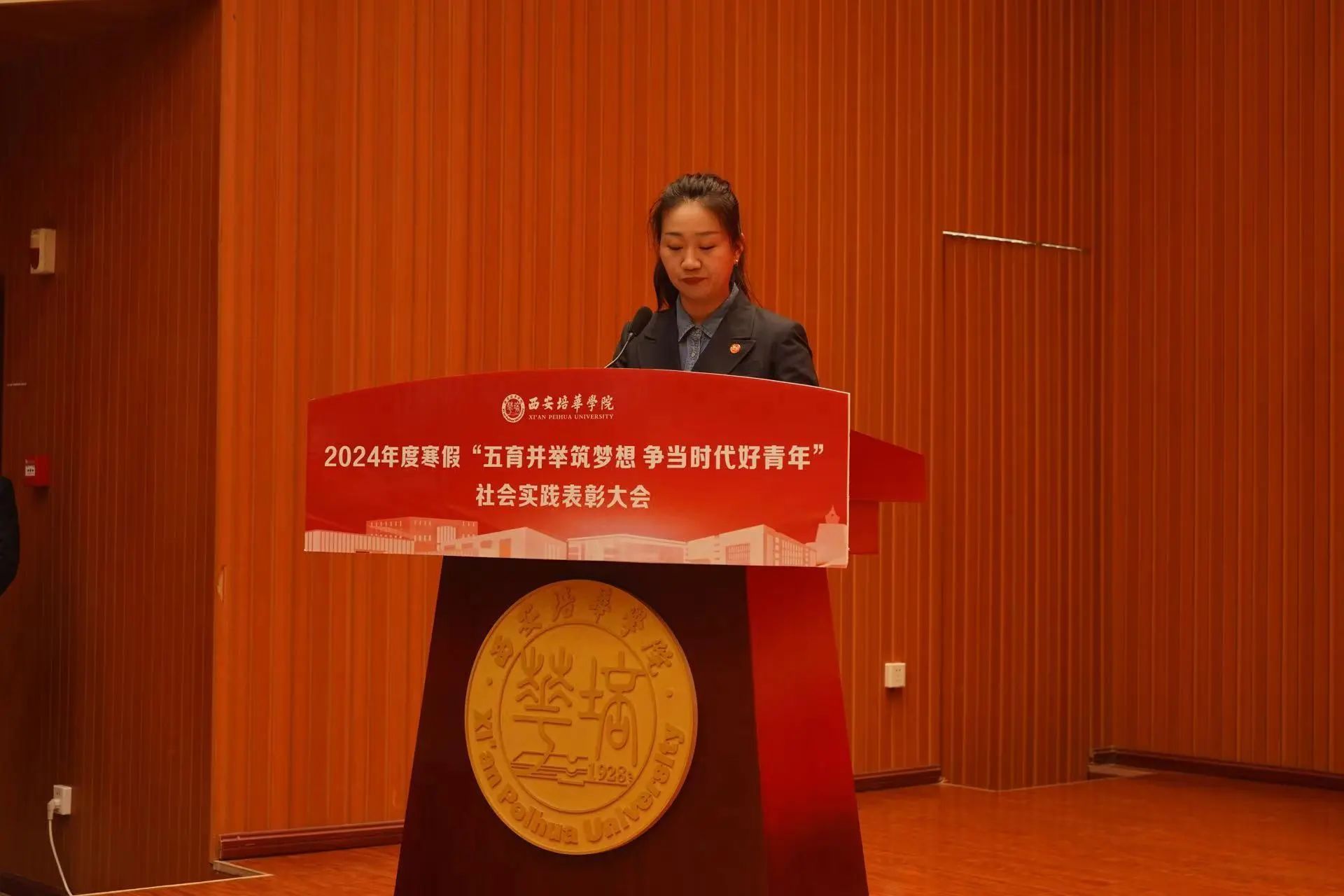 ▲校团委书记董莹宣读《西安培华学院关于表彰2024年寒假返家乡“五育并举”系列实践活动“先进个人”、“优秀指导教师”、“先进集体”的通报》