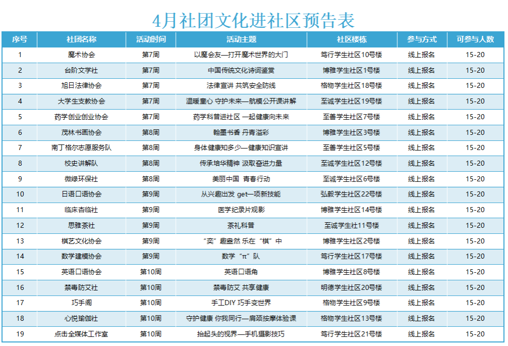 “社团文化进社区”主题活动立足学生社区文化浸润需求,结合学生社团发展特点,以文化活动为载体,以服务社区学生为目的,集趣味性、互动性、参与性于一体,将传统文化、红色文化、科技知识等文化知识,以同学们喜闻乐见的方式来呈现,让同学们再感受到文化的魅力,为全面推动”一站式“学生社区文化建设注入新的力量。4月“社团文化进社区”系列活动,活动主题丰富多彩,详情见预告表: