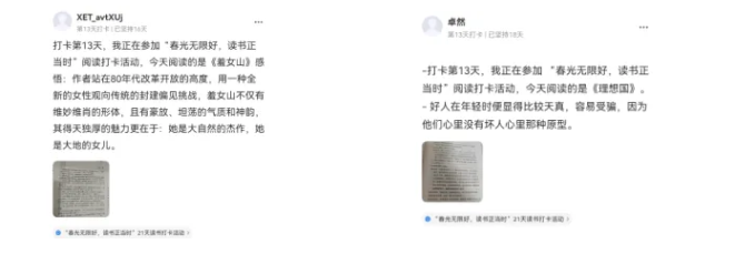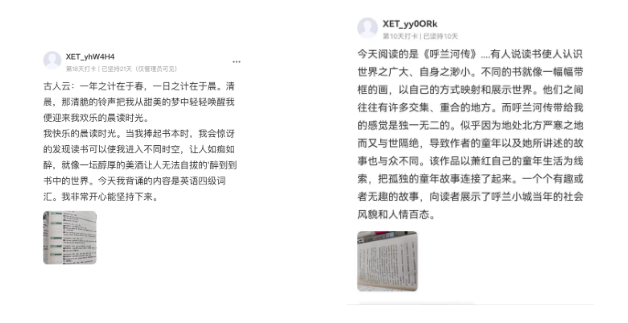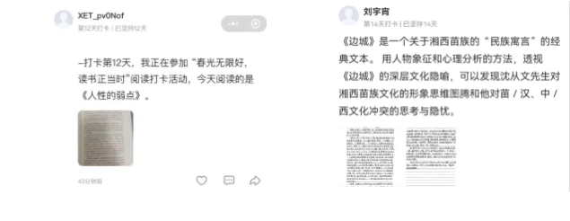 在打卡过程中,同学们阅读了许多优秀的书籍,比如《人性的弱点》、《理想国》、《羞女山》、《小妇人》和《又是一年芳草绿》等。从书籍的选择中可以看出,大家所喜爱的类型虽不同,但相同的是,都在阅读中收获了自由与快乐。