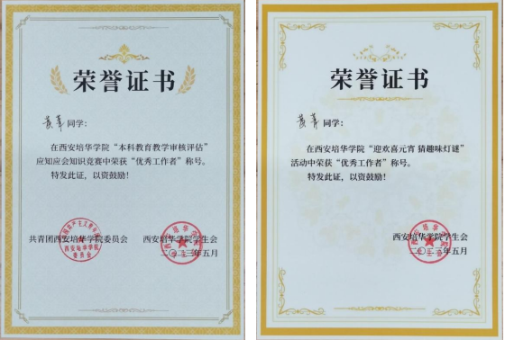 2.2023年5月获得西安培华学院“新时代好青年”荣誉称号;