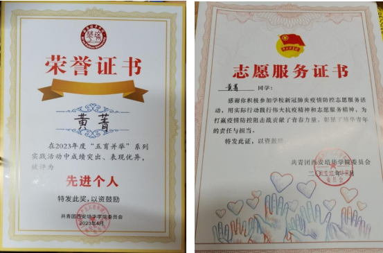 社会实践方面,在第二课堂中,黄菁同学积极参加各级各类比赛活动,大学期间共获国家级、省级荣誉7项、校级荣誉30余项;暑假期间,组织团队前往榆林米脂县,开展“粟有银州,生态米脂,青春助农”暑期三下乡社会实践,带领团队获得团中央立项两项,进入乡村基层,拍摄《银州印象》系列米脂宣传短片,以青春之声讲述米脂故事;在寒假期间,返乡后前往中共浙皖赣革命旧址,作为红色讲解员讲述着家乡故事,积极参加社会实践获评“五育并举”系列实践活动“先进个人”荣誉。志愿服务方面,在疫情期间,她积极参与公寓值班、核酸检测、校园巡逻、食堂执勤、返乡志愿等校园疫情防控志愿工作,获共青团西安培华学院委员会颁发的志愿服务证书,同时积极参与到雷锋月社区志愿服务工作当中,志愿时长超300小时。