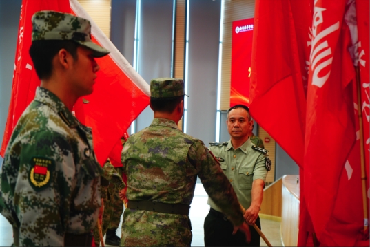 ▲军训团团长杜晓剑为军训团授营旗