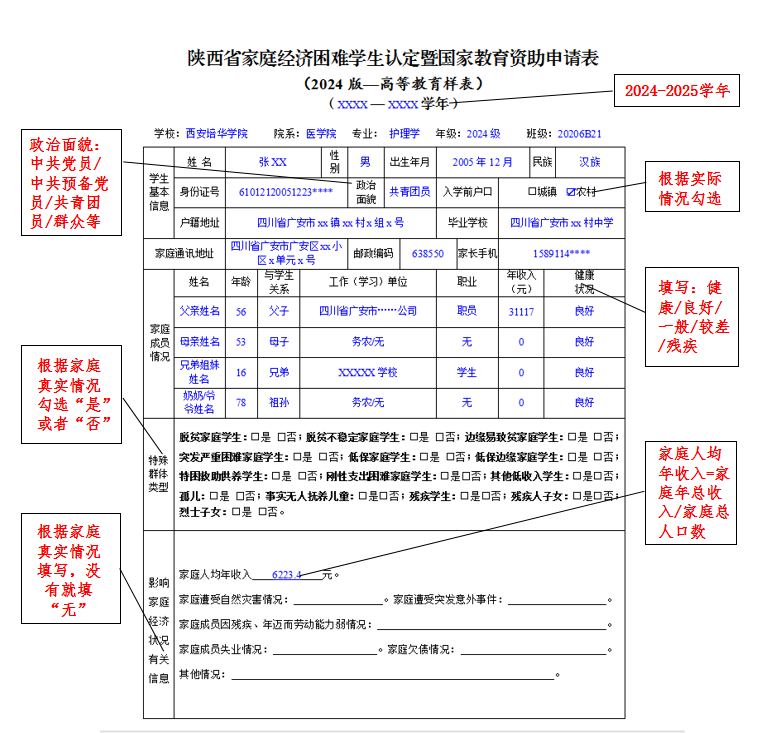 根据实际情况进行填写,填写为家庭人均年收入(家庭人均年收入=家庭年总收入/家庭总人口数),金额须与“家庭成员情况年收入”相对应,家庭总人口数须与表中家庭成员情况数加学生本人的总数对应。