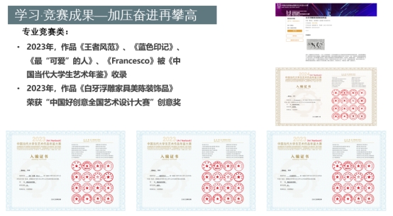 慕钟远同学深知积跬步方可至千里,以加压奋进再攀高为目标,积极参与各类专业竞赛,4幅绘画作品收录于《中国当代大学生艺术年鉴》;2023年,作品《白牙浮雕家具美陈装饰品》荣获中国好创意全国艺术设计大赛创意奖