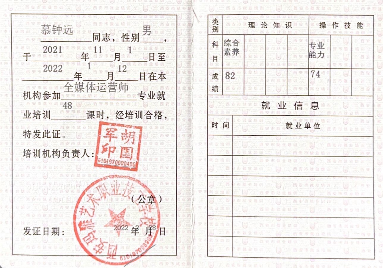 入学以来,慕钟远同学时刻将学习放在首位,以不待扬帆自奋蹄为根本,专业成绩名列年级第二,荣获培华二等奖学金、三等奖学金、学业进步奖。并且努力学习基础技能,考取CEAC平面设计师、影视制作专家、商务办公专家、全媒体运营师、普通话二级甲等证书10余项,极大地丰富了知识体系并掌握了专业技能。