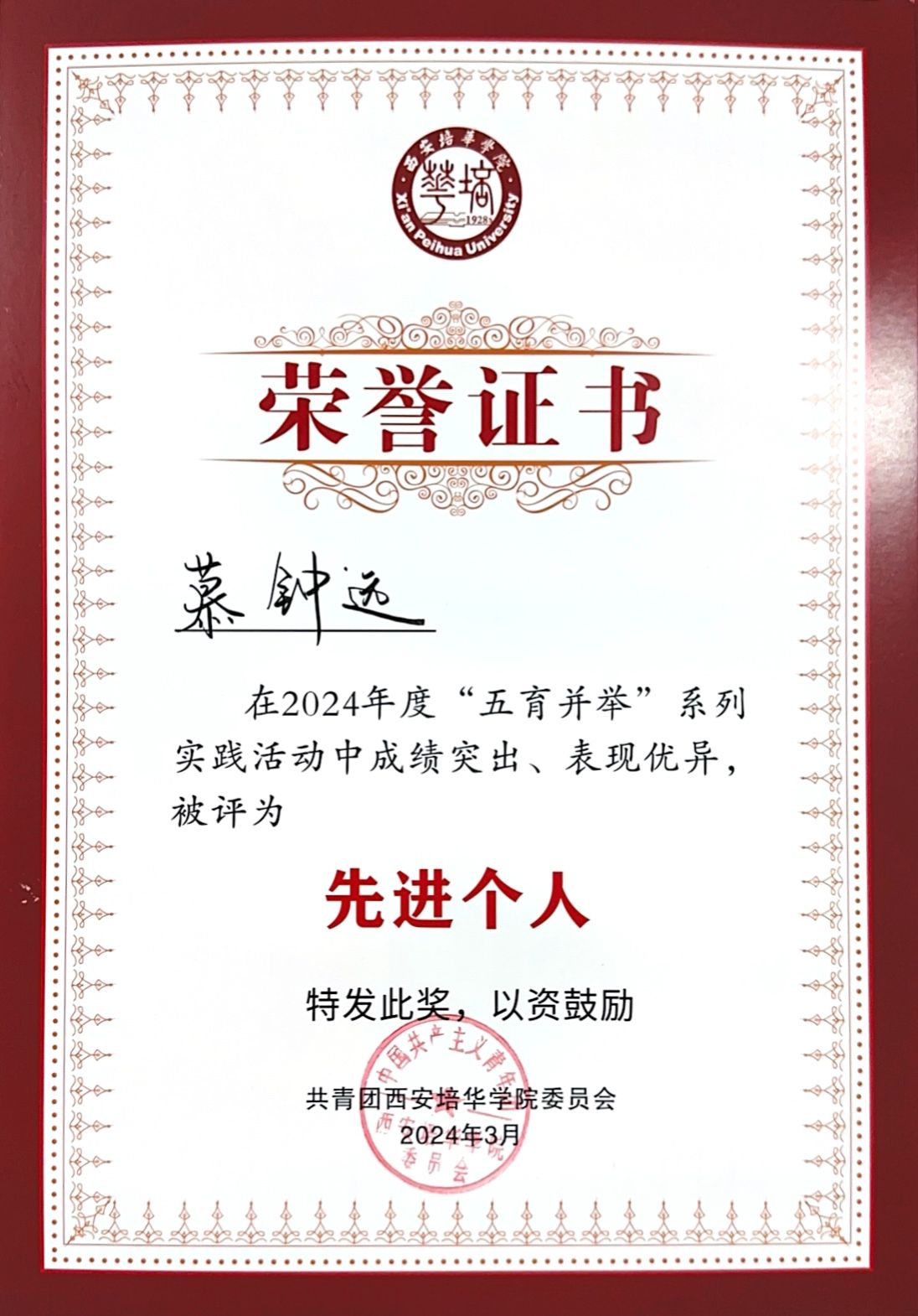 1.2024年4月,获得“五育并举”先进个人;