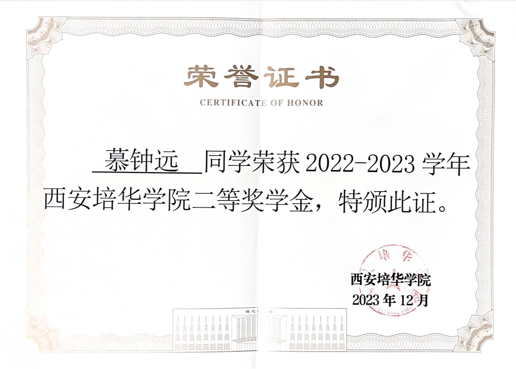 4.2023年12月获得西安培华学院二等奖学金;