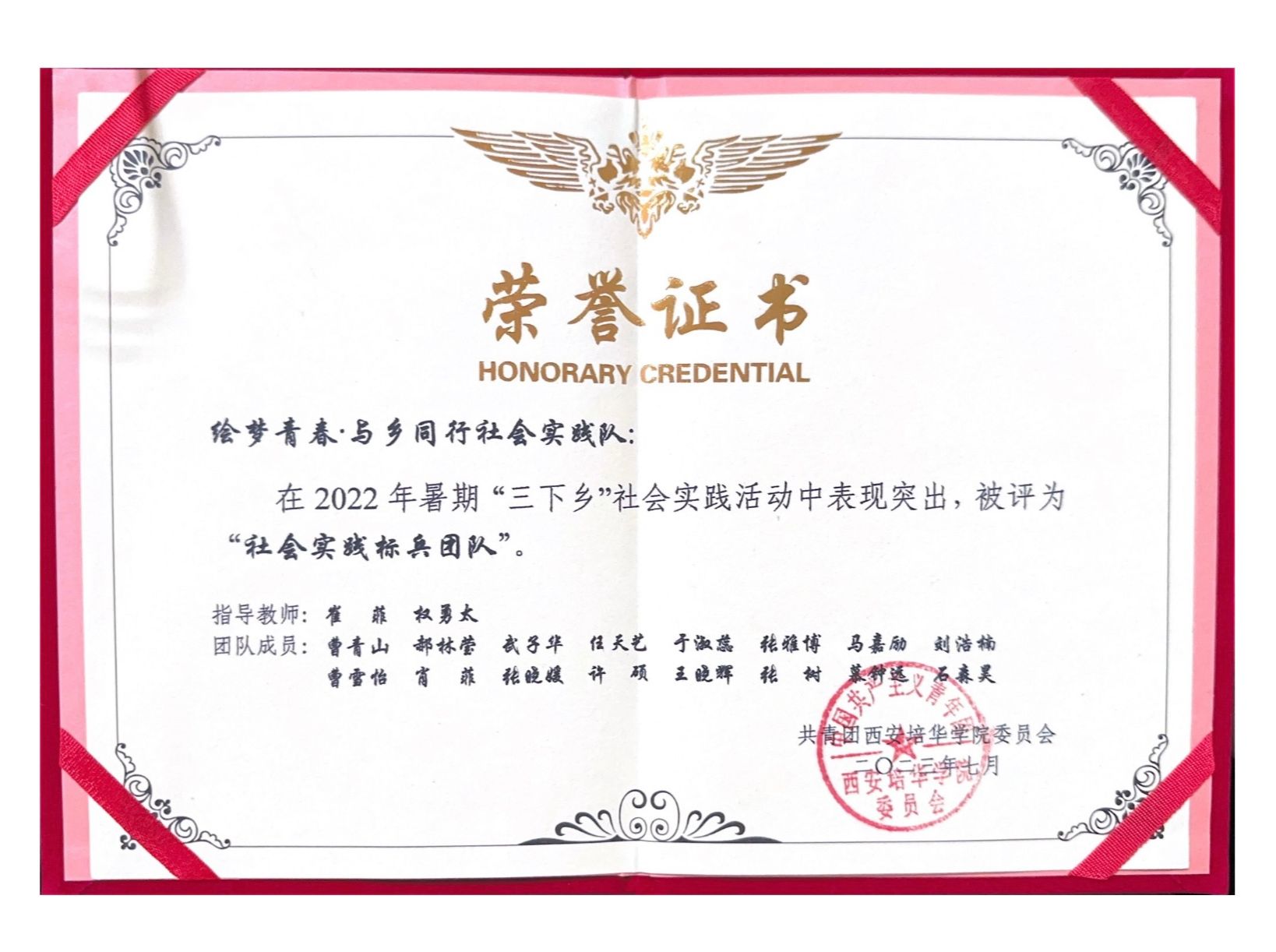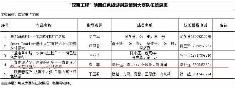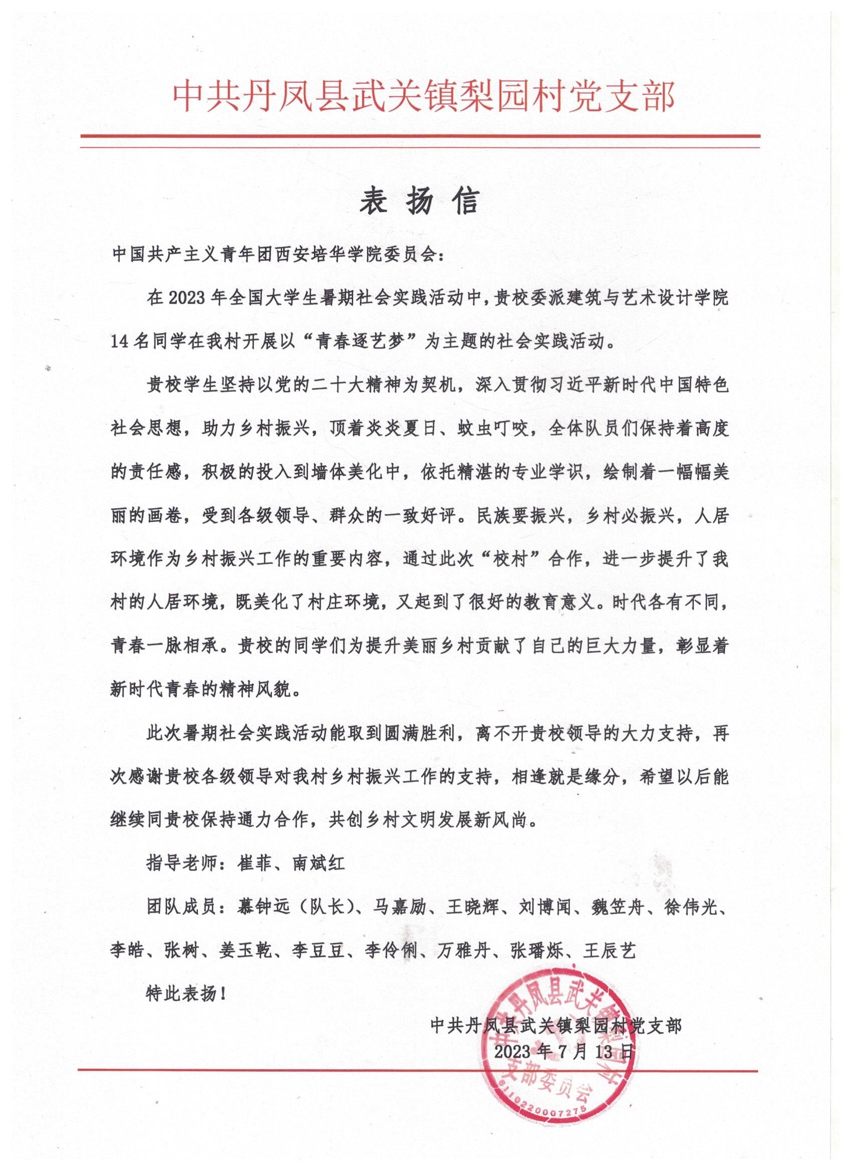 2022年慕钟远同学参加了在长安区西樊村开展的“绘梦青春·与乡同行”暑期三下乡社会实践,结合村庄特色以及专业特长,绘制24节气图,受到当地村民的一致好评,所在项目被列为校级重点项目,被评为2022年西安培华学院社会实践标兵团队。23年暑假慕钟远同学组织班级14名同学参加暑期三下乡社会实践,在商洛丹凤县武关镇梨园村开展“青春逐艺梦,画笔绘新乡”主题墙绘活动,在当地墙体绘制百米长卷,助力乡村振兴,也收获了丰富的实践成果,当地政府的表扬、村民的肯定。同时,结合“三下乡”地点丹凤县,参加陕西省红色旅游创意策划大赛,并经由学校审批推荐至省赛。
