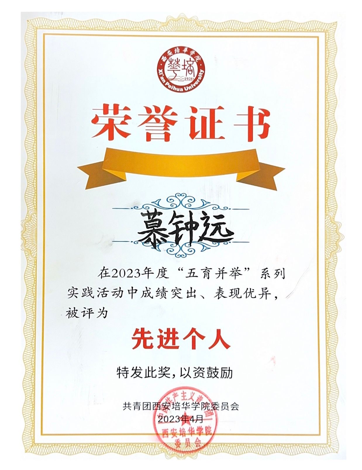 8.2023年4月获得“五育并举”先进个人;