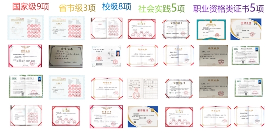 三年以来,经过不断的丰富与积累,学习方面共计获得国家级奖项9项、省市级3项、校级8项、社会实践5项、职业资格类证书5项。