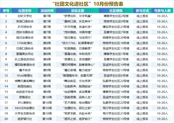 立足学生社区文化发展需求,结合学生社团发展特色,以文化活动为载体,以服务社区学生为目的,集趣味性、互动性、参与性于一体,将社团文化与社区文化融为一体,以同学们喜闻乐见的方式,让同学们感受到文化的魅力,强化“一站式”学生社区文化育人功能。10月“社团文化进社区”系列活动,活动主题结合学校办学特色与人才培养实际,开展不同主题的丰富活动,详情见预告表: