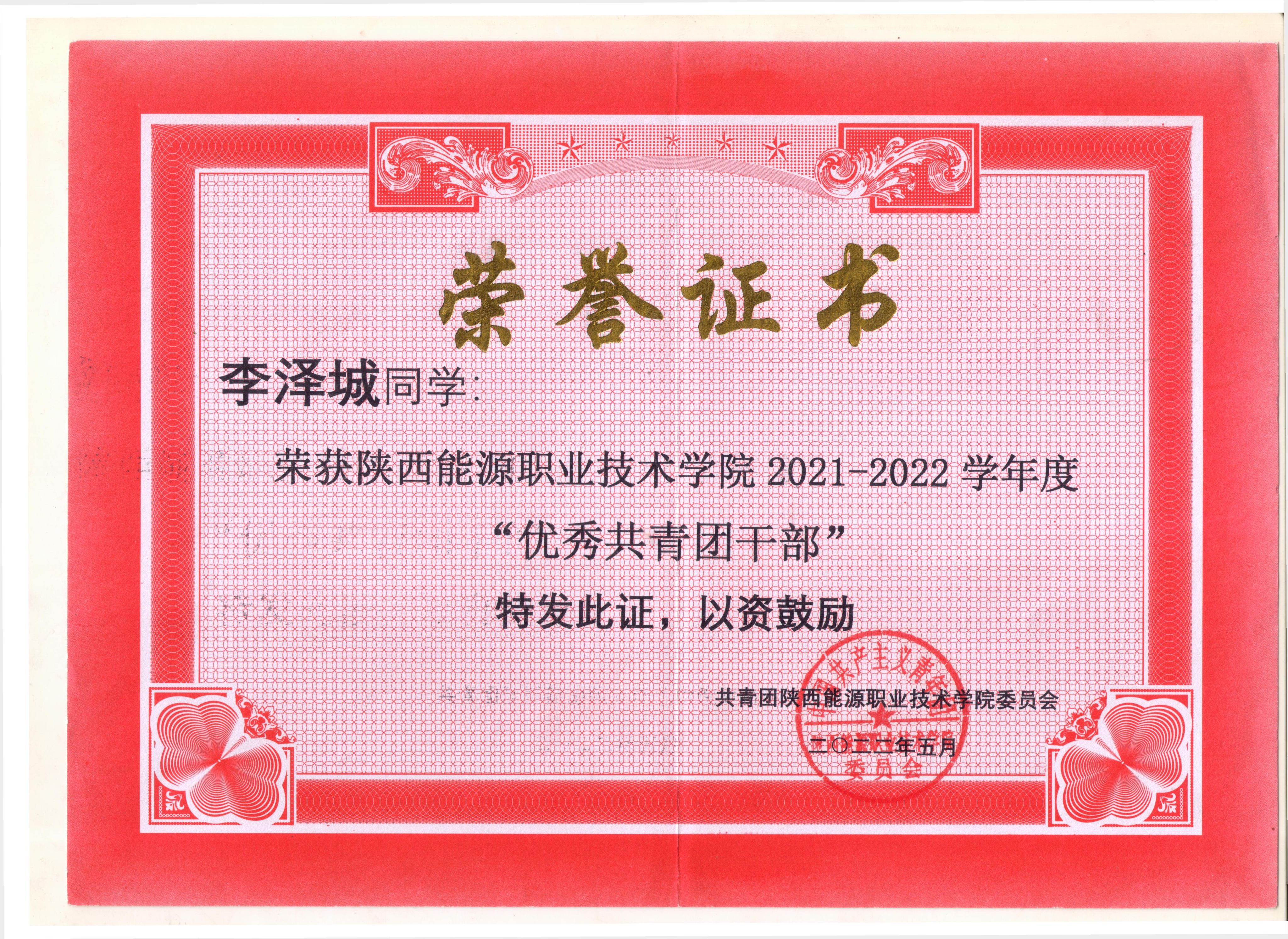 2.2023年7月获陕西省优秀学生干部荣誉称号;