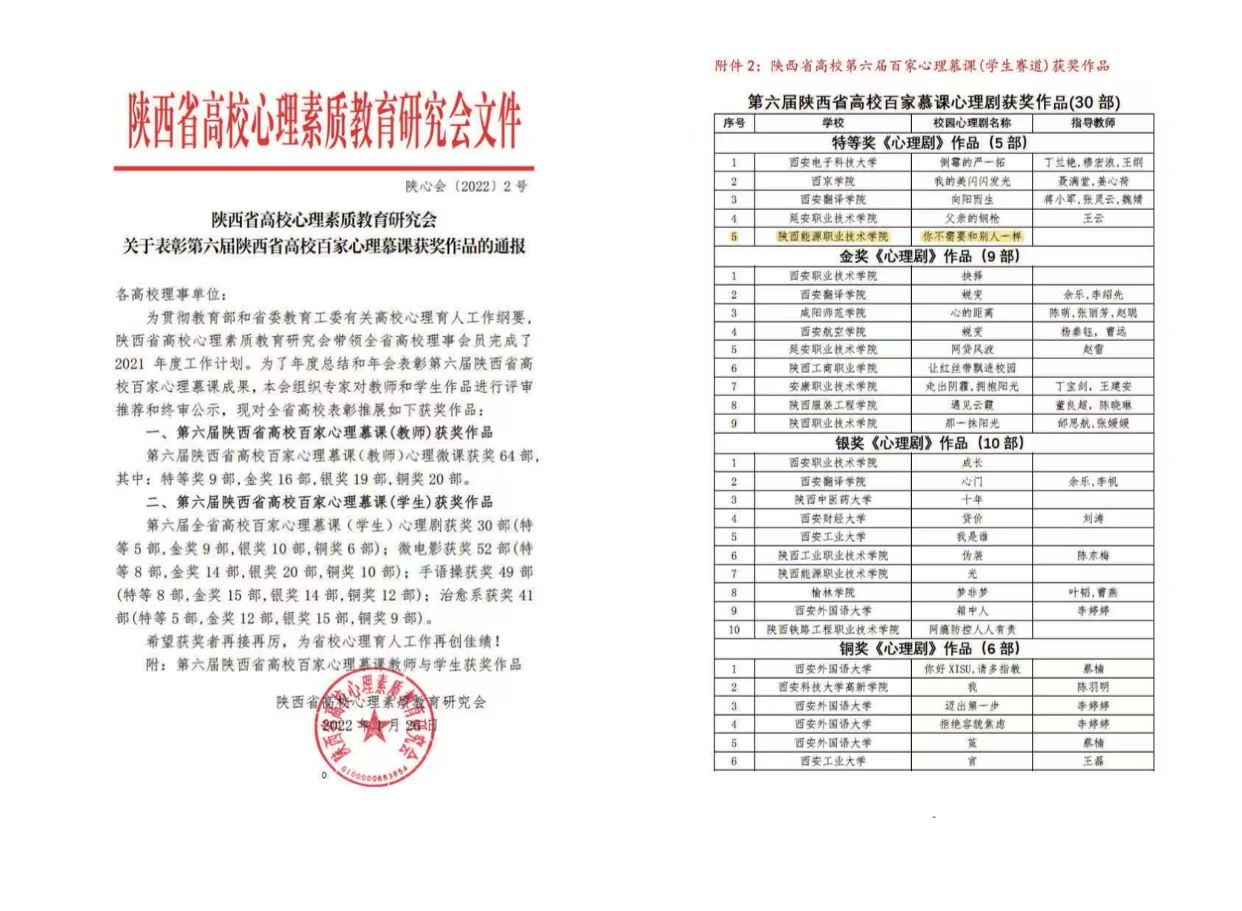 6.2022年1月获第六届陕西省高校慕课《心理剧》学生组特等奖。