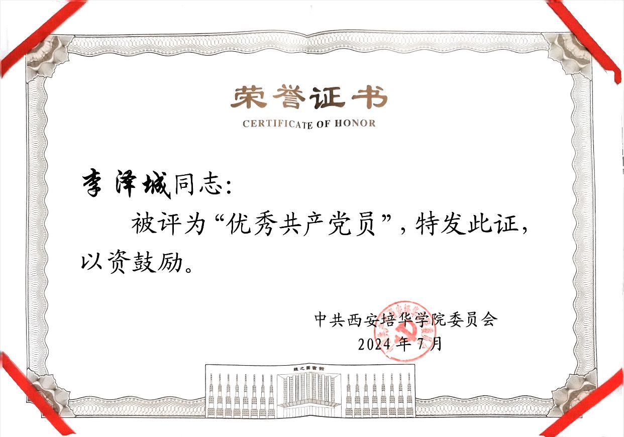 回望百年,斑斑青史映照铮铮铁骨。改革者们奋力“杀出一条血路来”,无不展现了中国人的骨气,无不激荡着不屈不挠、奋勇前进的青春力量。带着这样一种崇敬和敬仰之情,李泽城同学积极向党组织靠拢,刚进入大学就递交了入党申请书,在校期间他品行端正、自立自强,现已成为一名中共党员,在生活学习中他时刻起到先锋模范带头作用,并于2024年获得西安培华学院优秀共产党员荣誉称号。