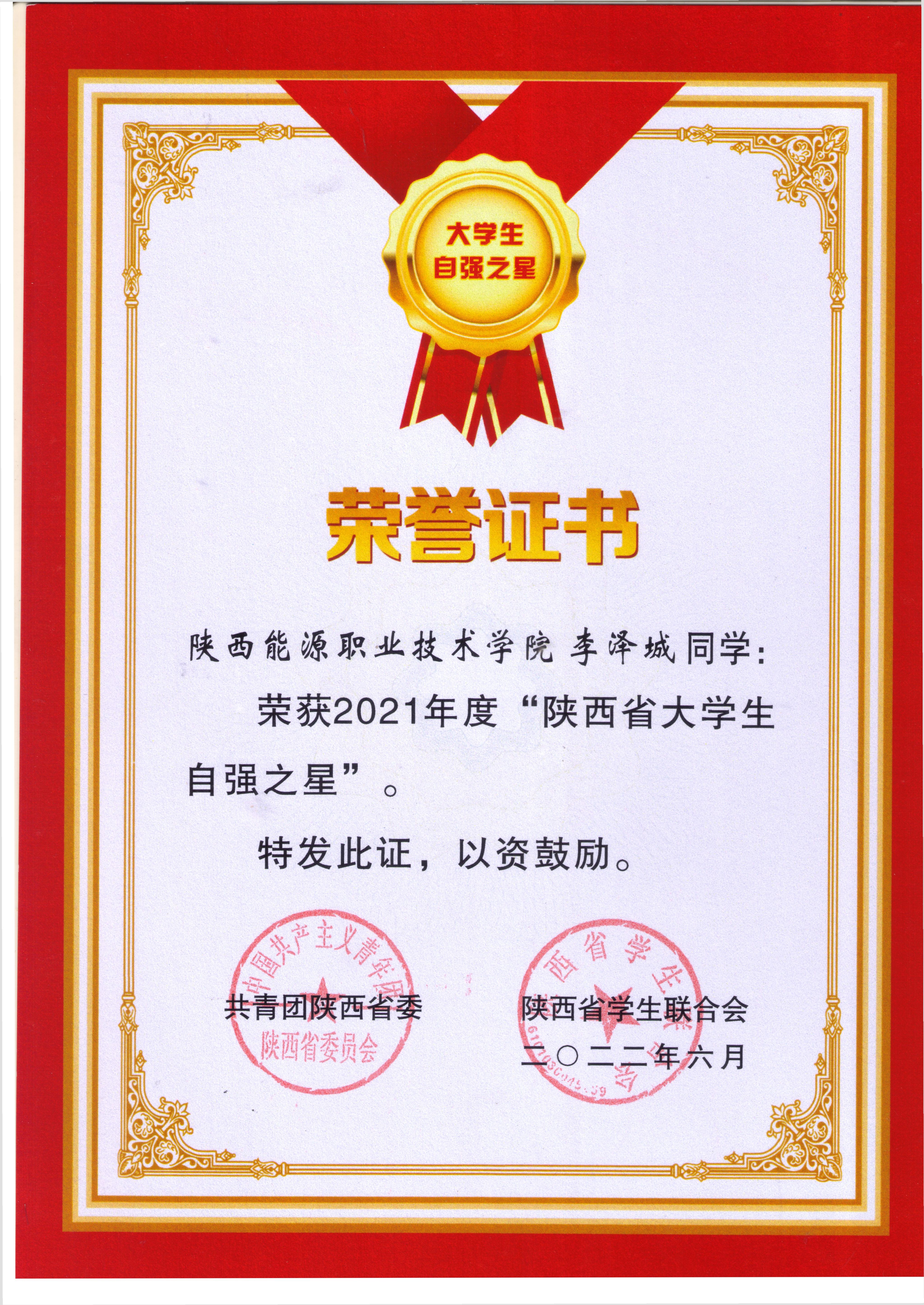 4.2022年6月获陕西省大学生自强之星荣誉称号;