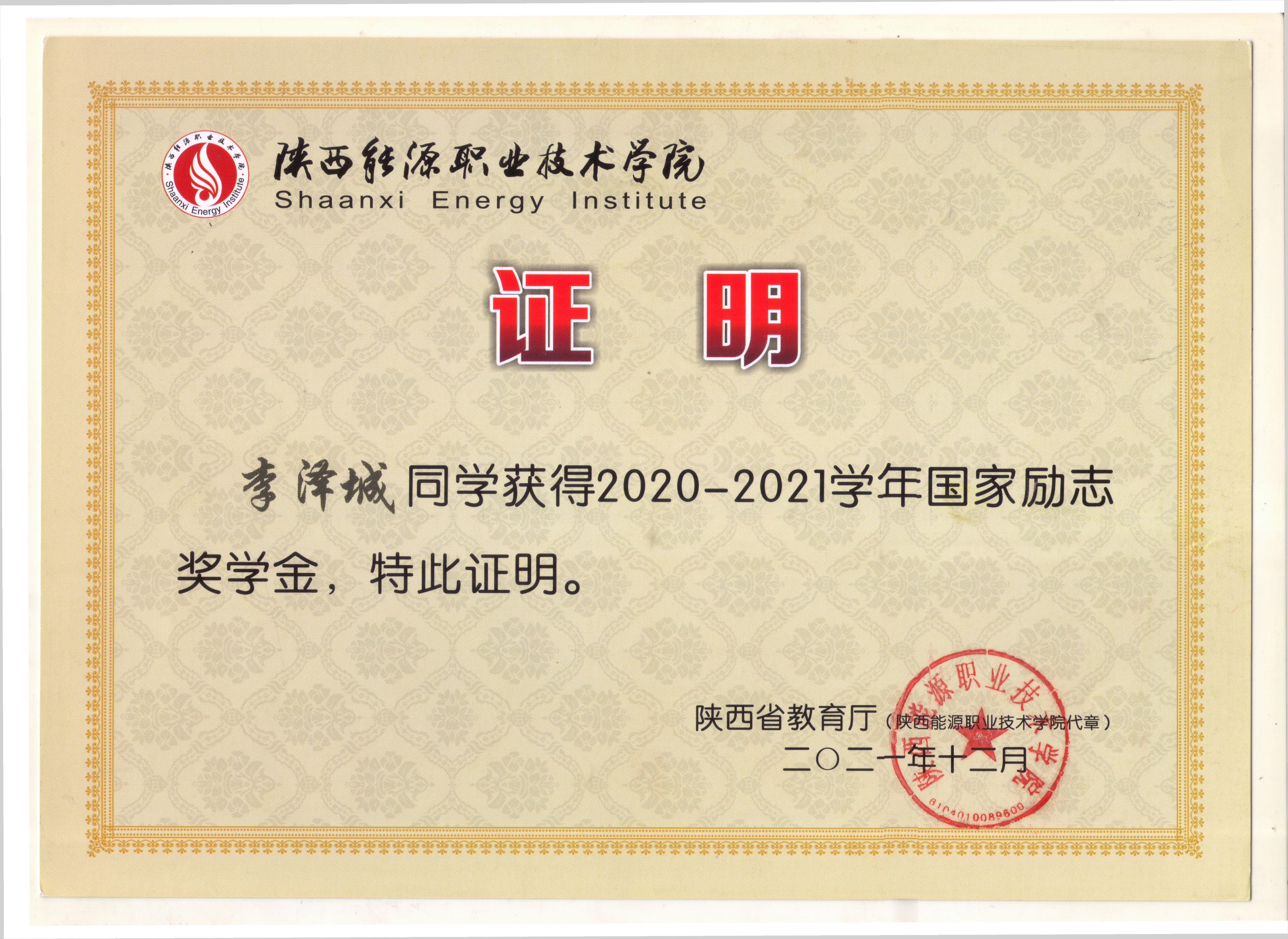 6.2021年12月获国家励志奖学金。