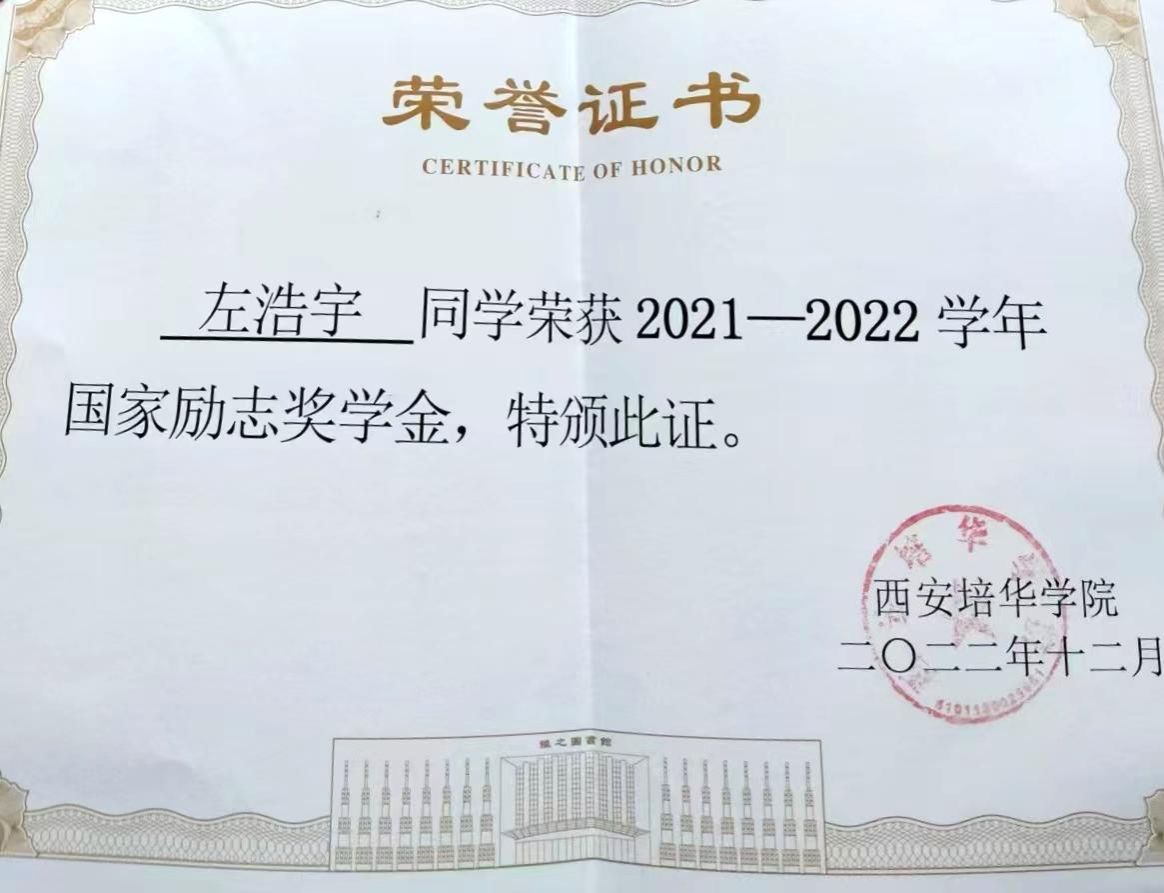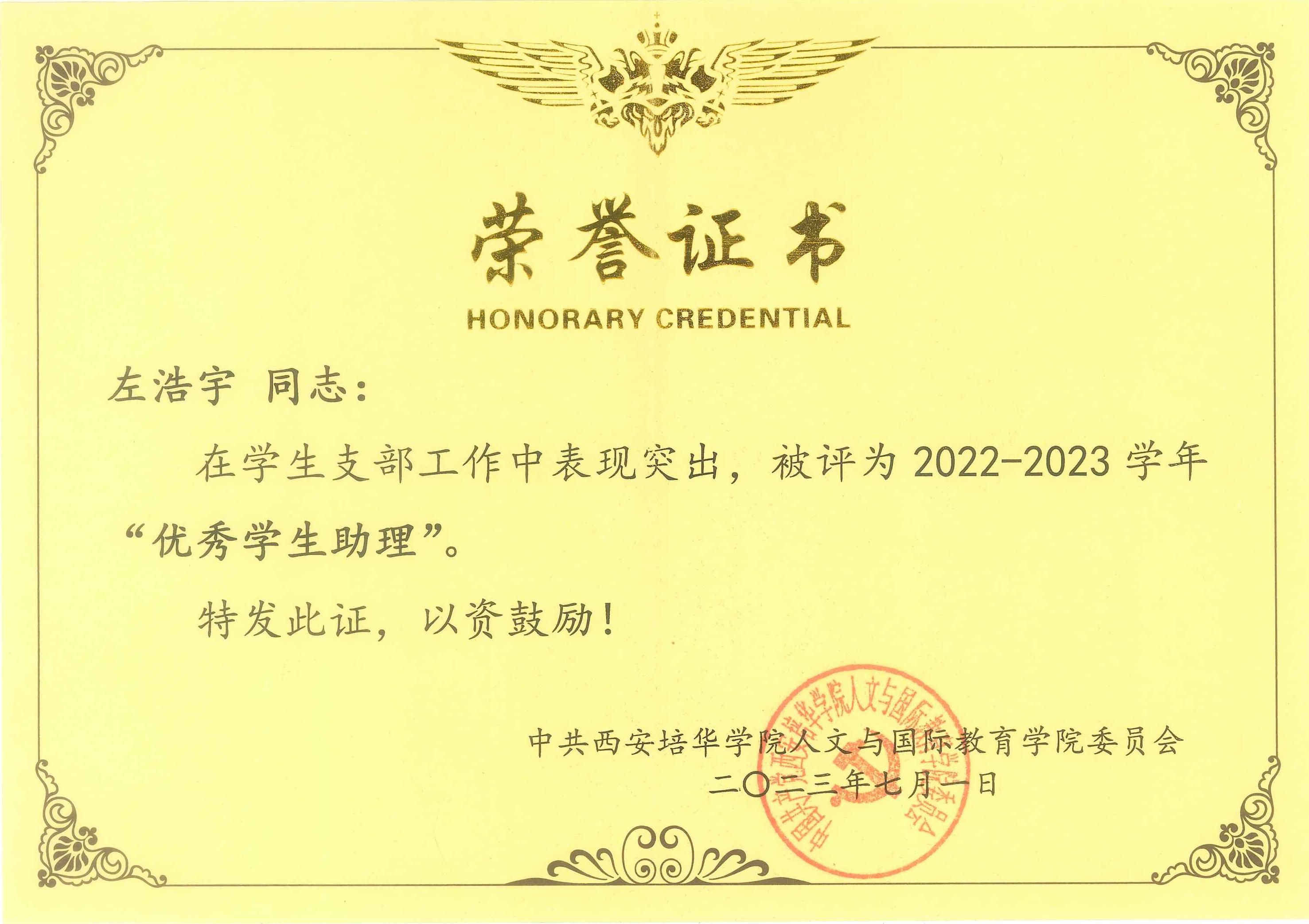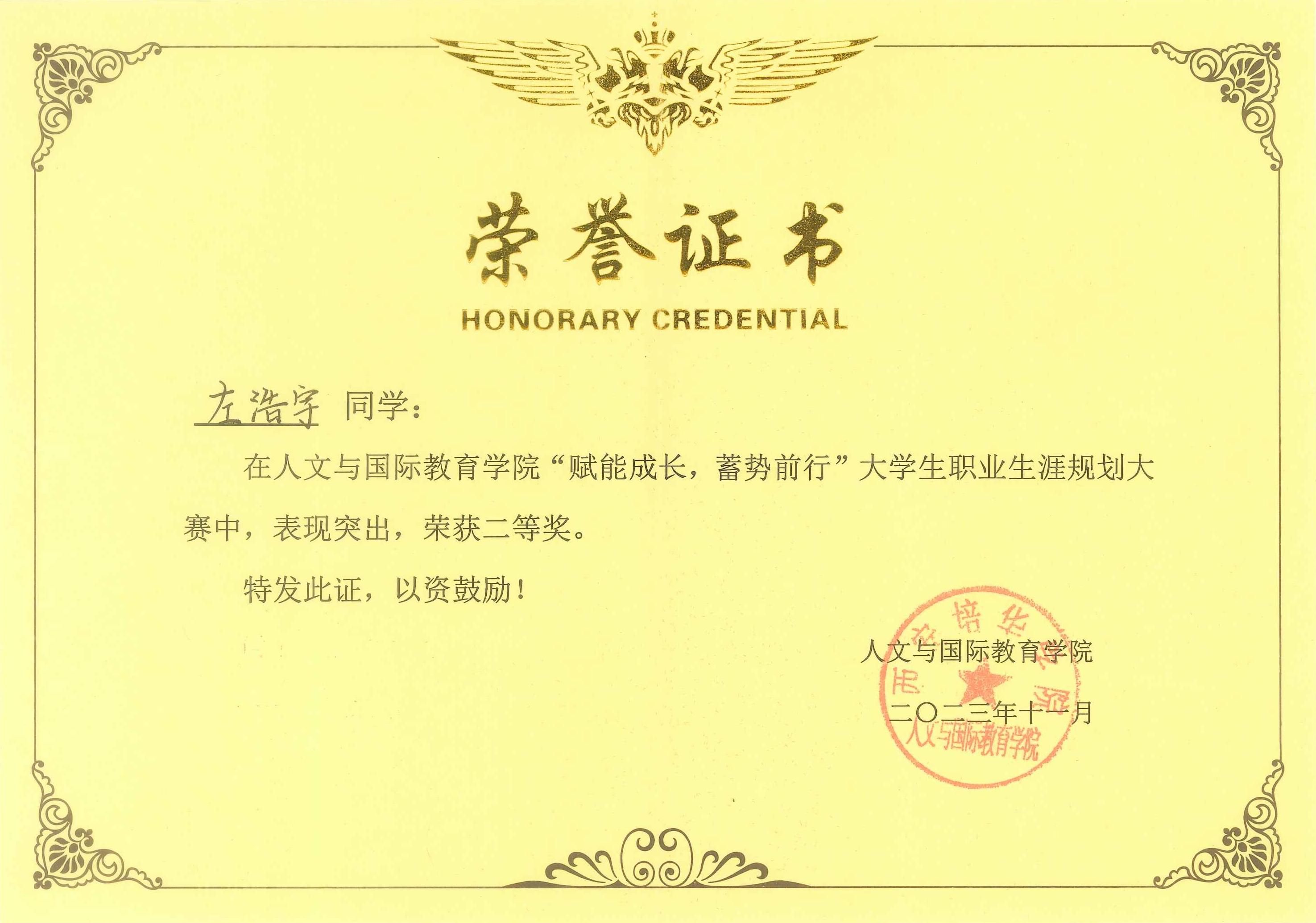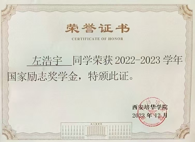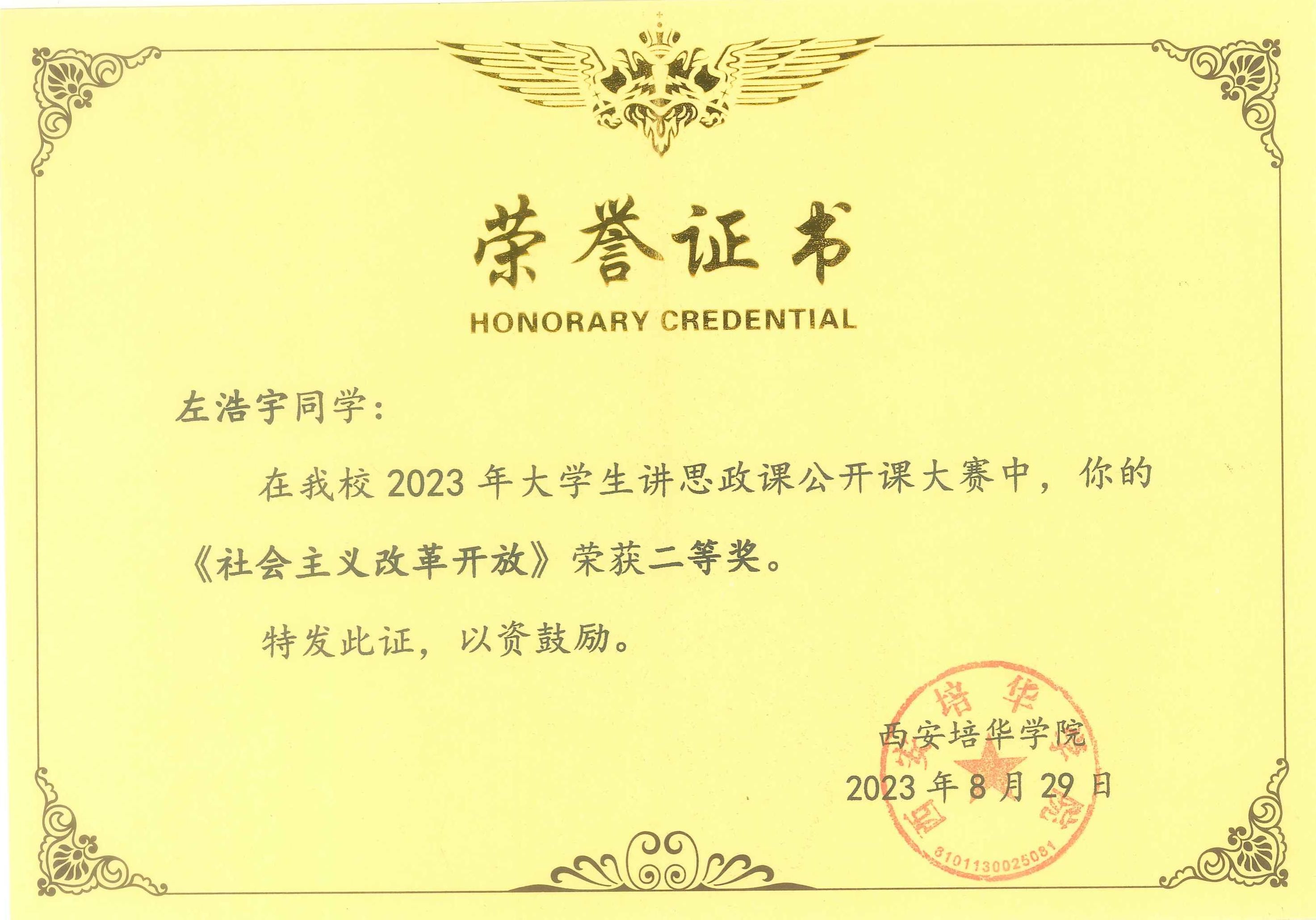 在校期间,左浩宇系统学习了法学基础理论课程,努力构建全面的法学知识体系,踏实向上。在课堂上始终保持端正、谦虚的学习态度,积极配合老师讲课,认真预习并按时完成各科作业,课下认真钻研,自觉拓展自己各方面的知识,始终将学习放在首位,认真刻苦,上进心强,不断夯实专业基础知识,学习成绩名列前茅,成绩班级排名1/50,年级排名1/201,各方面表现突出。目前已通过英语四级考试,取得普通话二级甲等证书和健康管理师证书,获得学科竞赛奖学金,连续两年获得国家励志奖学金,获得第八届陕西省学生“学宪法 讲宪法”大赛暨国赛选拔赛高校组二等奖、2023年西安培华学院大学生讲思政公开课大赛二等奖等奖项。