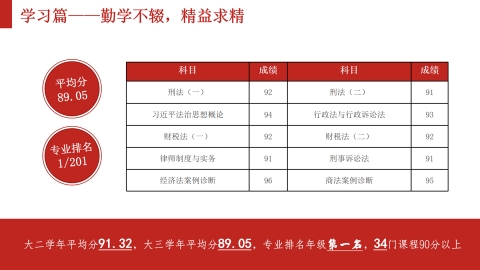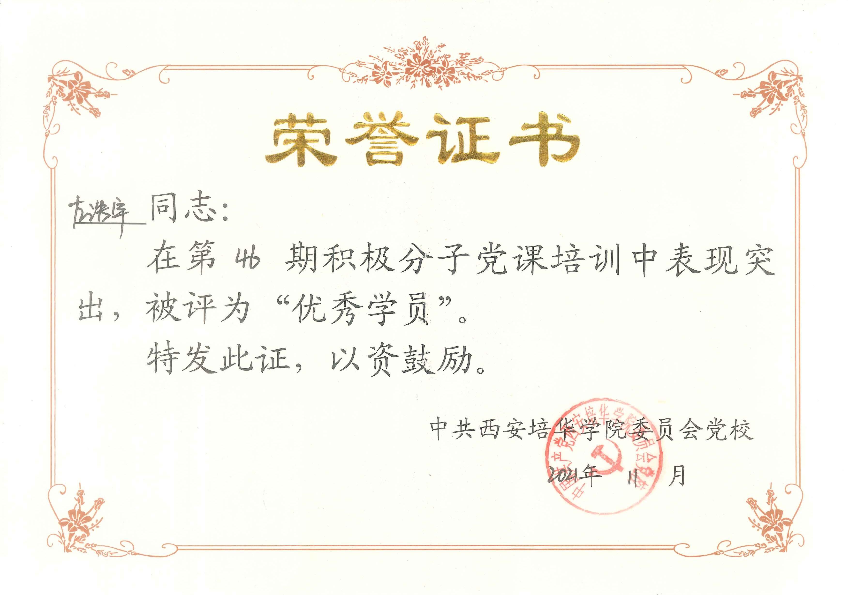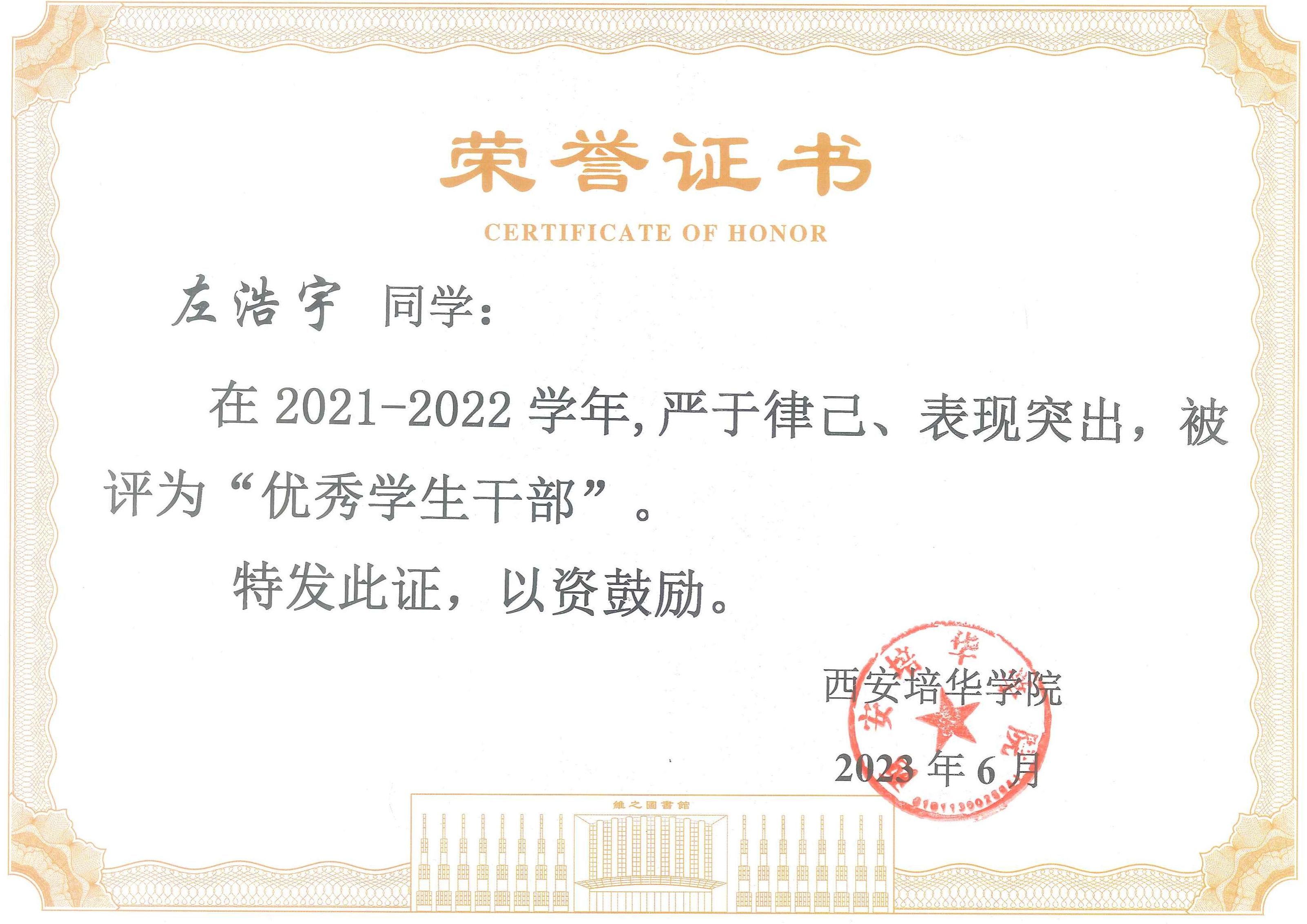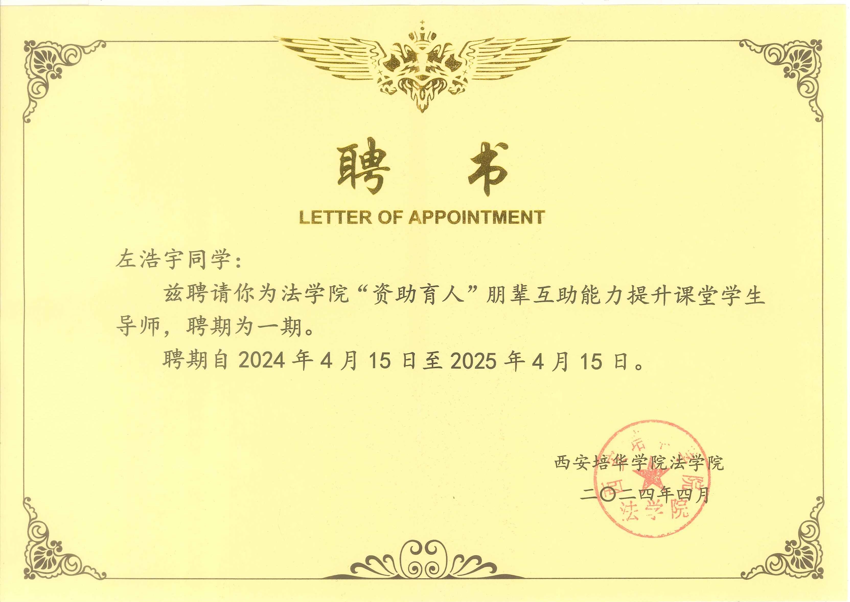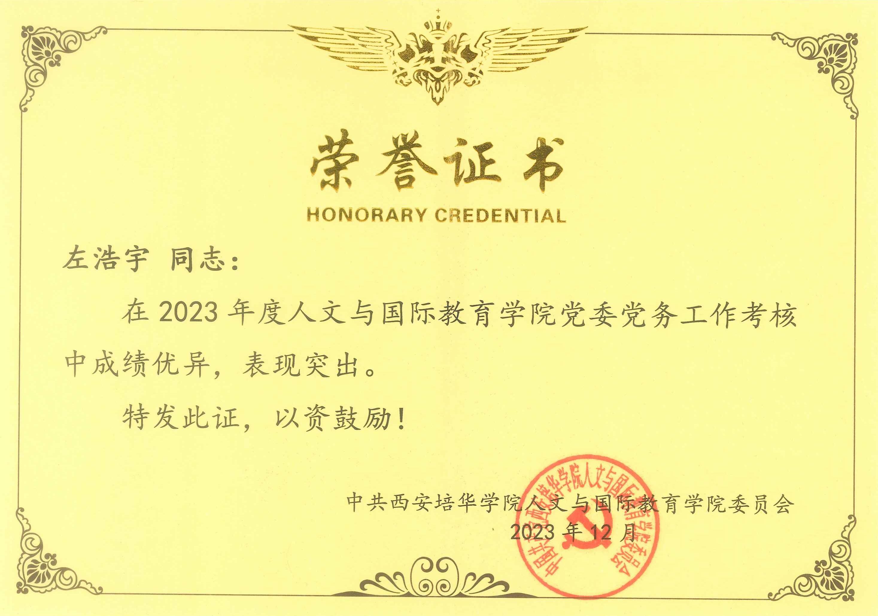 在校期间,左浩宇系统学习了法学基础理论课程,努力构建全面的法学知识体系,踏实向上。在课堂上始终保持端正、谦虚的学习态度,积极配合老师讲课,认真预习并按时完成各科作业,课下认真钻研,自觉拓展自己各方面的知识,始终将学习放在首位,认真刻苦,上进心强,不断夯实专业基础知识,学习成绩名列前茅,成绩班级排名1/50,年级排名1/201,各方面表现突出。目前已通过英语四级考试,取得普通话二级甲等证书和健康管理师证书,获得学科竞赛奖学金,连续两年获得国家励志奖学金,获得第八届陕西省学生“学宪法 讲宪法”大赛暨国赛选拔赛高校组二等奖、2023年西安培华学院大学生讲思政公开课大赛二等奖等奖项。