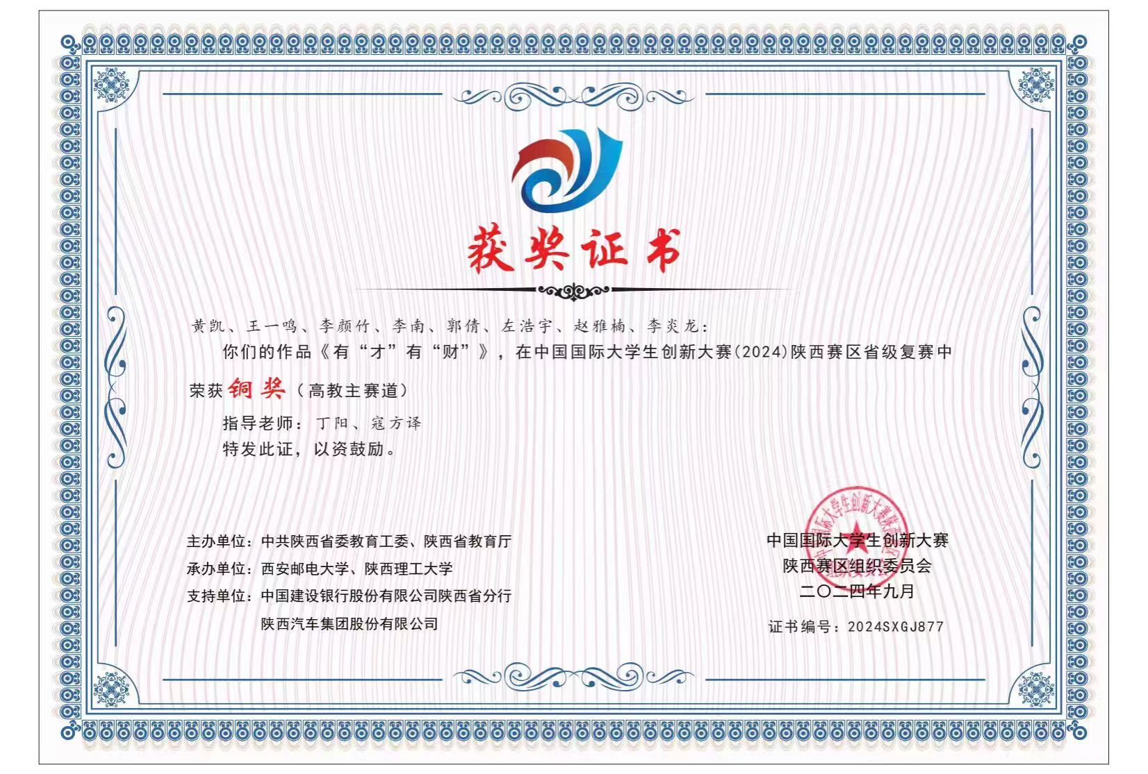 2.2024年中国国际大学生创新大赛《有“才”有“财”》项目获陕西赛区省级铜奖、校赛二等奖;