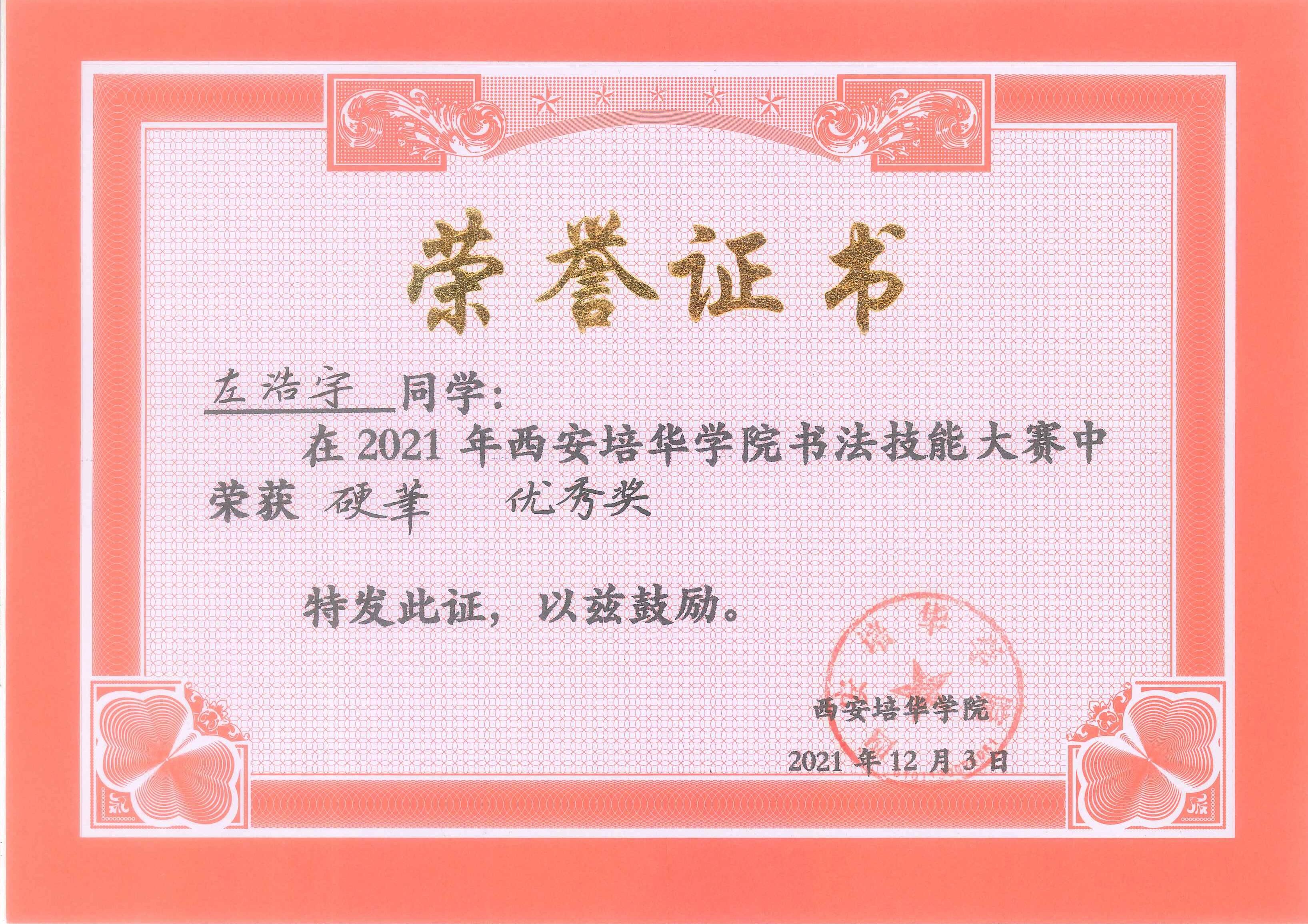 19.2021年获得西安培华学院书法技能大赛硬笔优秀奖;
