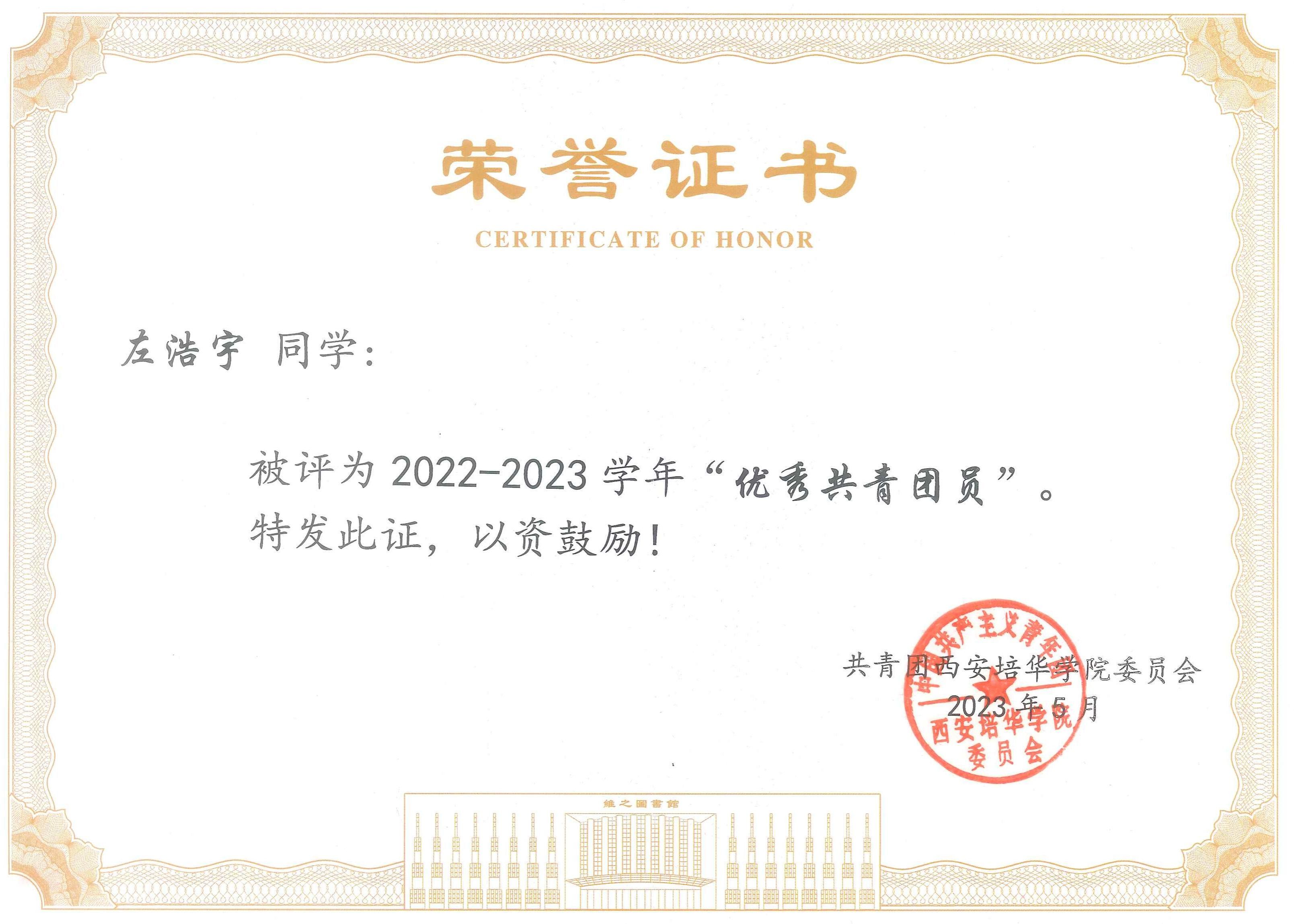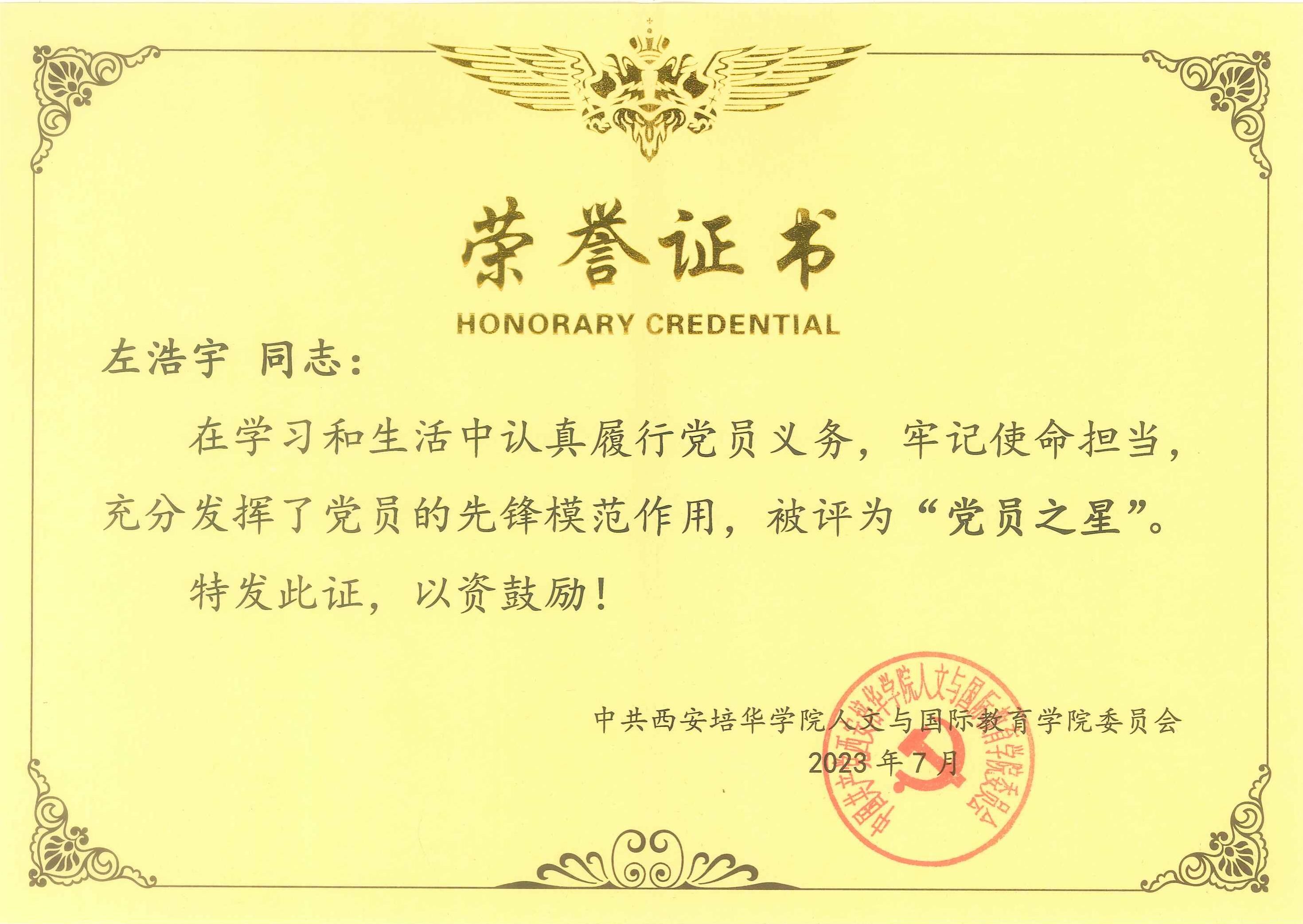 左浩宇理想信念坚定,自强向上,爱党爱国,树立了良好的人生观和道德观,始终保持与时俱进,在严格要求自己的同时,还在不断鼓励、帮助身边的同学。他平日里积极学习党的思想,关注国家时事政策,能够积极主动参加党纪学习教育,立志用自己所学专业知识为新时代法治建设贡献力量。先后被评为2021年中共西安培华学院委员会党校第46期积极分子培训“优秀学员”、优秀共青团员、新时代好青年、党员之星、优秀共产党员等。
