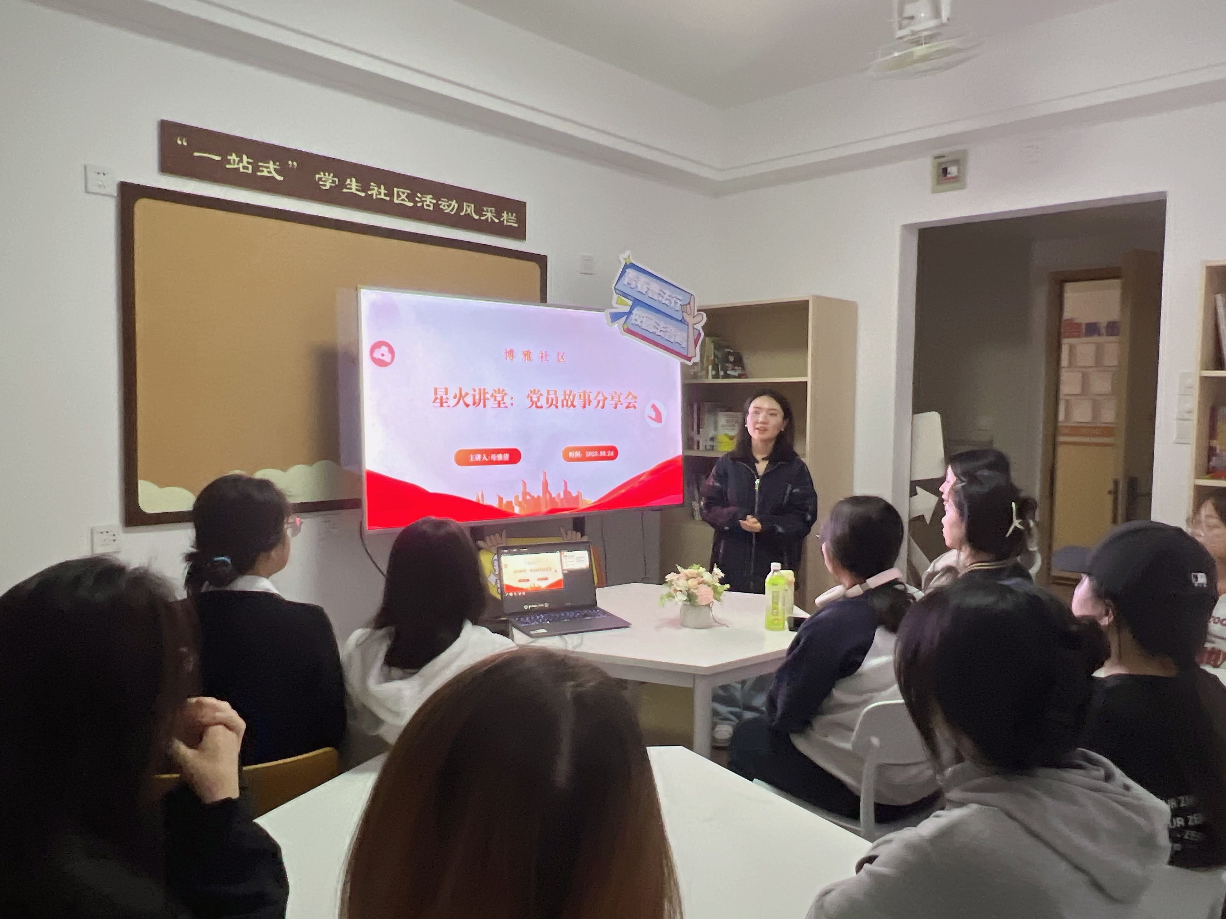 博雅学生社区德育导师母雅倩在3号楼开展了“星火讲堂:党员故事分享会”红色主题教育。在本次活动中,德育导师母雅倩带领10余名学生深入探讨了党员精神的内涵与传承,通过真实感人的党员故事分享,让参与学生深刻感受到了党员们的初心与使命,以及他们在平凡岗位上的不凡贡献。