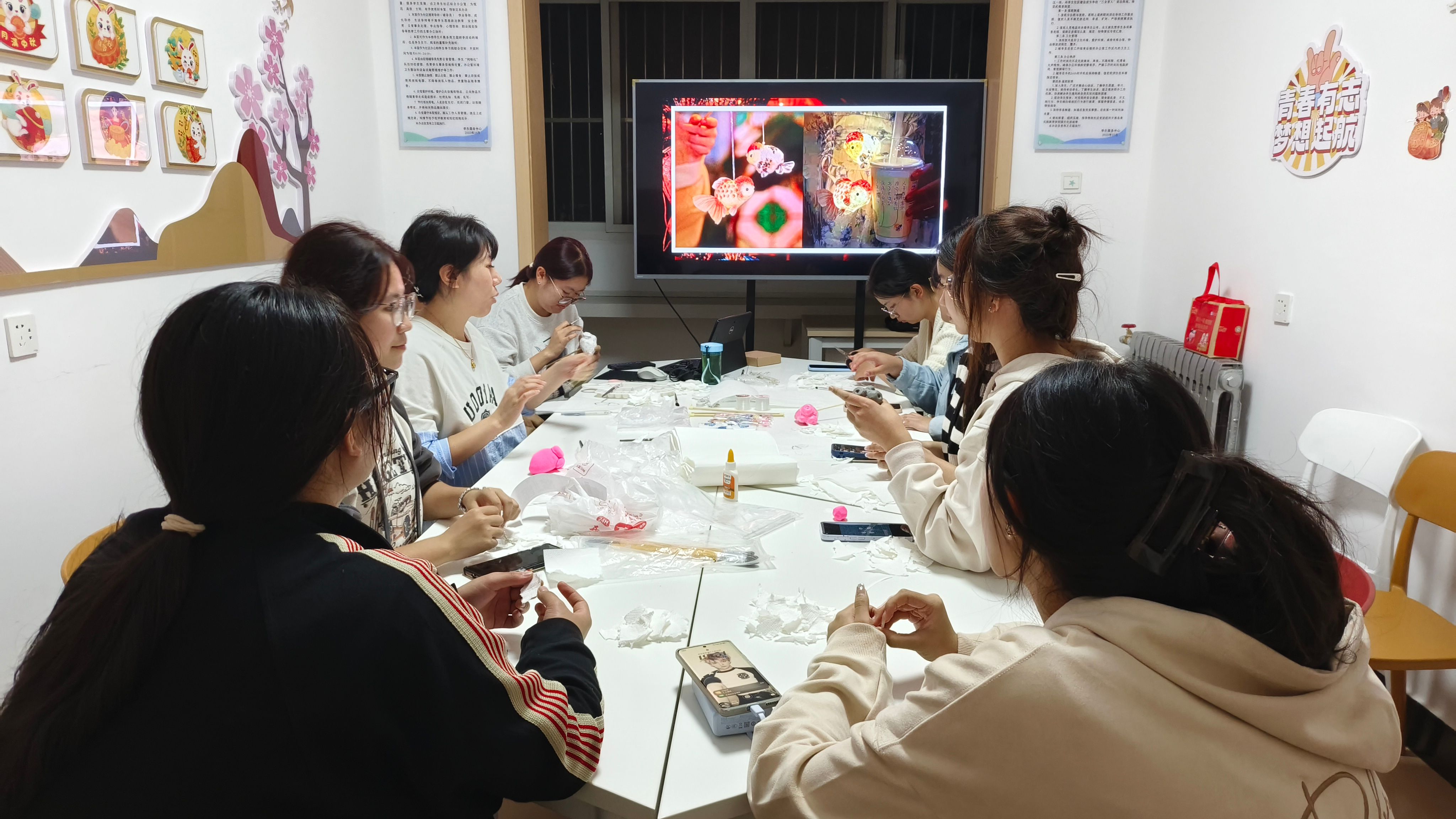 老师从骨架搭建到纸面粘贴,再到细节装饰,每一步都讲解得清晰明了。现场学生分组制作,经过一番努力,灵动的金鱼花灯在手中诞生,光影流转间传递着传统节庆文化的温情与匠心。