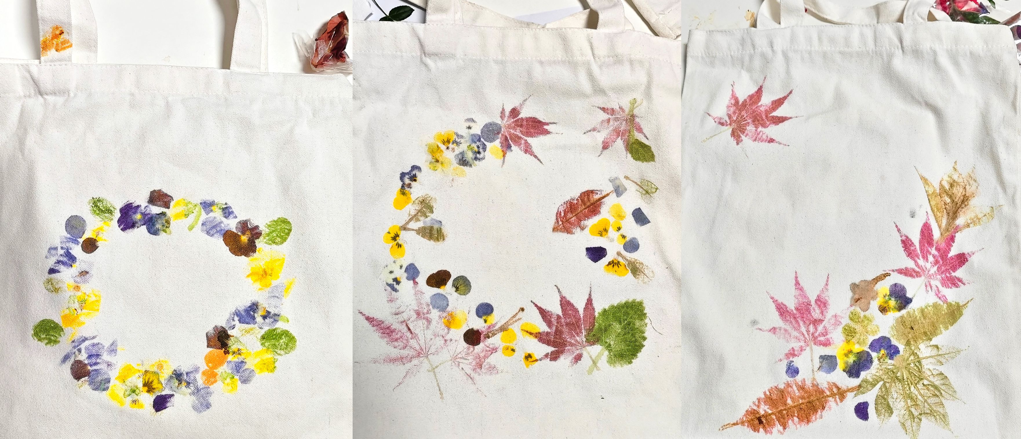 同学们对拓染文化有一定了解后开始动手实践,将新鲜的花叶摆放、捶打拓印于棉布包上,形成天然纹样。通过体验拓印过程,提高学生的动手实践能力,感受拓染文化的独特魅力,激发学生对传统文化的热爱。