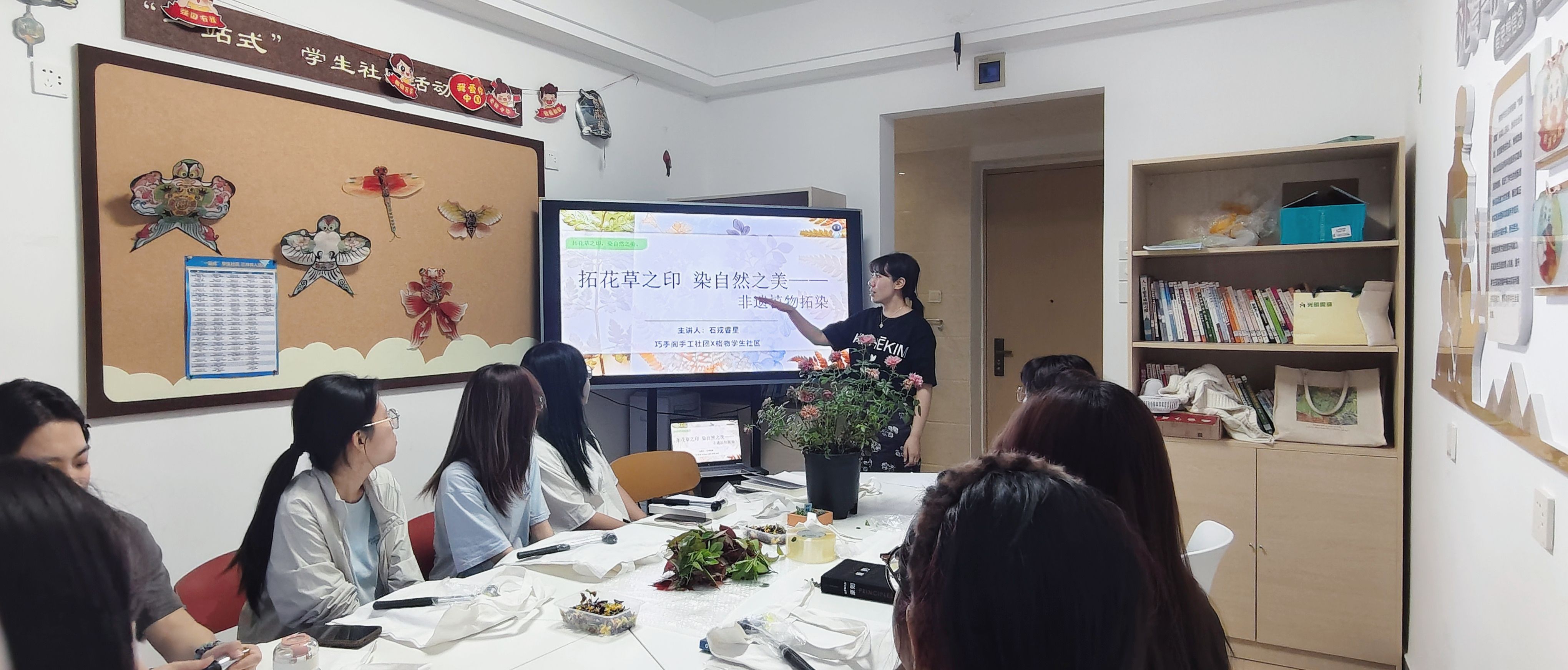 植物拓染是中国的一种传统染色工艺,是利用天然花草与纤维布料进行创作的艺术体验。石老师带领学生学习拓染的历史文化背景和艺术价值,了解其文化内涵。