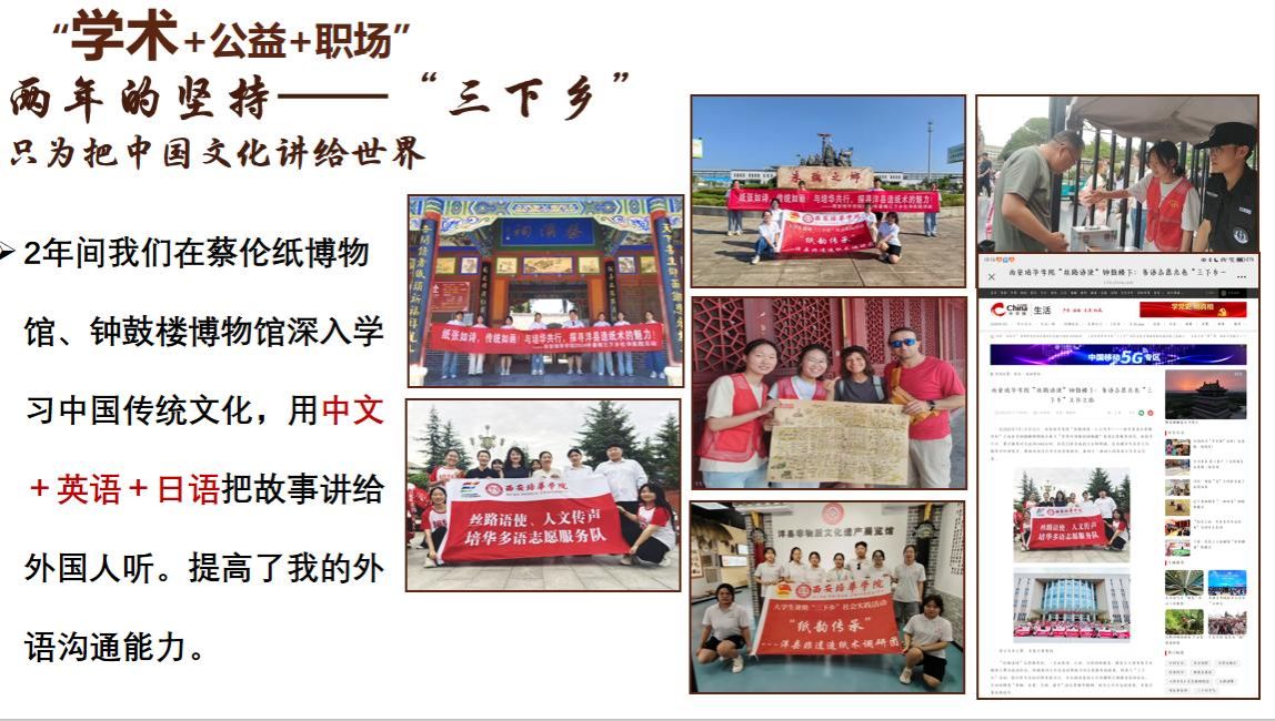 2024年暑期,她作为队长,带领“三下乡”团队奔赴洋县,开启了对非遗造纸术的深度调研。2025年暑期,她的实践探索迈向了一个新的高度。她再次扛起队旗,担任 “丝路语使、人文传声——培华多语志愿服务队”队长。这一次,她的舞台是世界的——西安钟鼓楼。团队成功获得校级立项,并以“中文+英语+日语”的多语模式,团队开展了高达1440小时的文旅志愿服务,接待中外游客万余人次。与来自美、法等国的数十位外国游客交流,倾听他们的西安印象,也向他们讲述地道的中国故事。让西安钟鼓楼的历史文化,跨越语言屏障,“声”入丝绸之路,传递到世界的角落。这项实践,完美地融合了她的日语专业能力、跨文化交际能力与团队领导力,是她“日语+法律”复合路径上一次极为成功的预演。