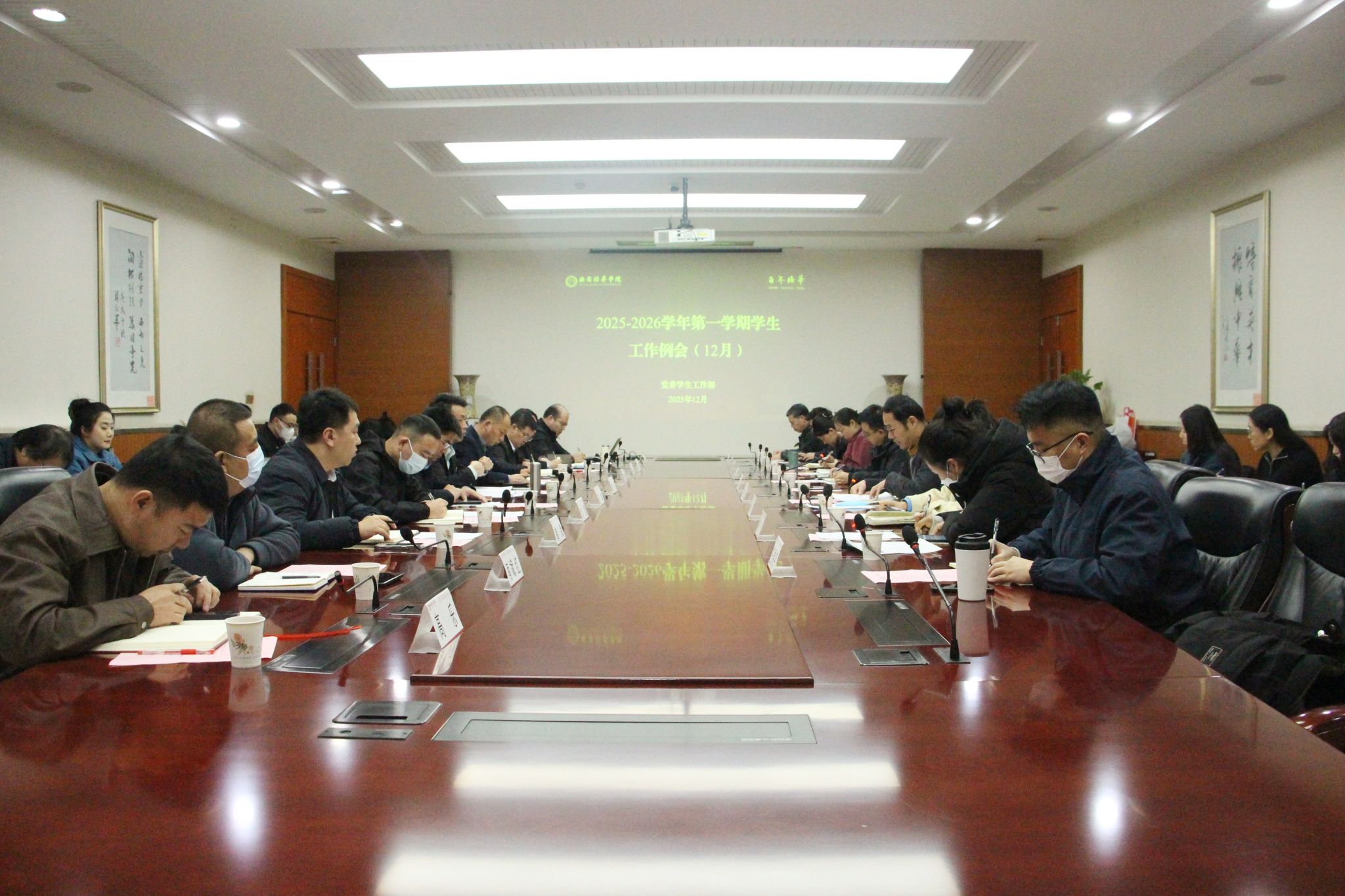 为全面落实、部署学生工作重点,提升学生教育、管理、服务水平,12月2日下午,在明德楼第一会议室召开2025-2026学年12月学生工作会议。我校党委副书记蔡亮,招生与就业指导中心主任姚斌,学生潜能发展中心主任韩赟,党委学工部部长权勇太、副部长杨媛,校团委书记董莹,各二级学院党委(党总支)书记、副书记,学生干事、团委书记参加了本次会议。本次会议由党委学工部部长权勇太主持。