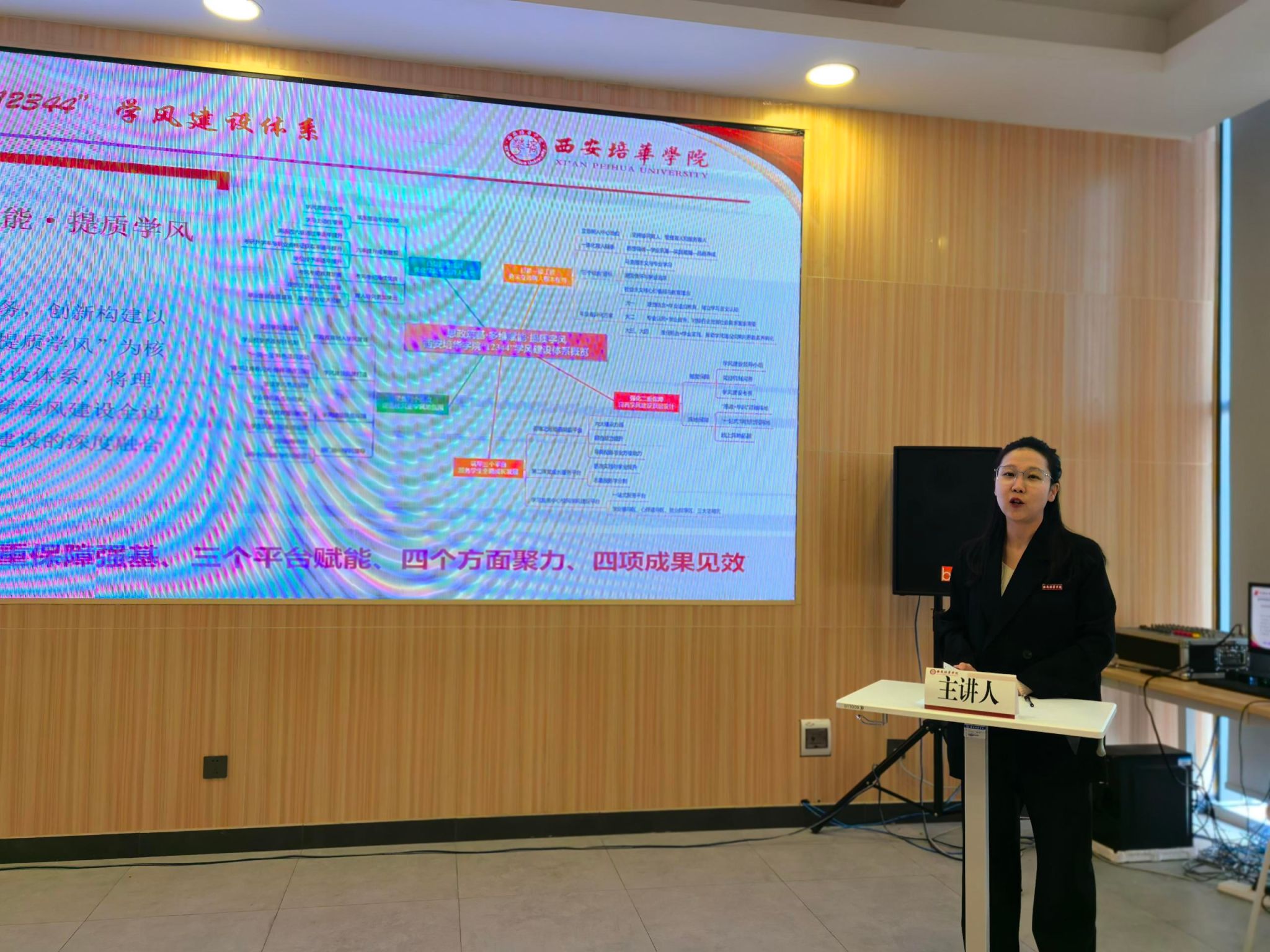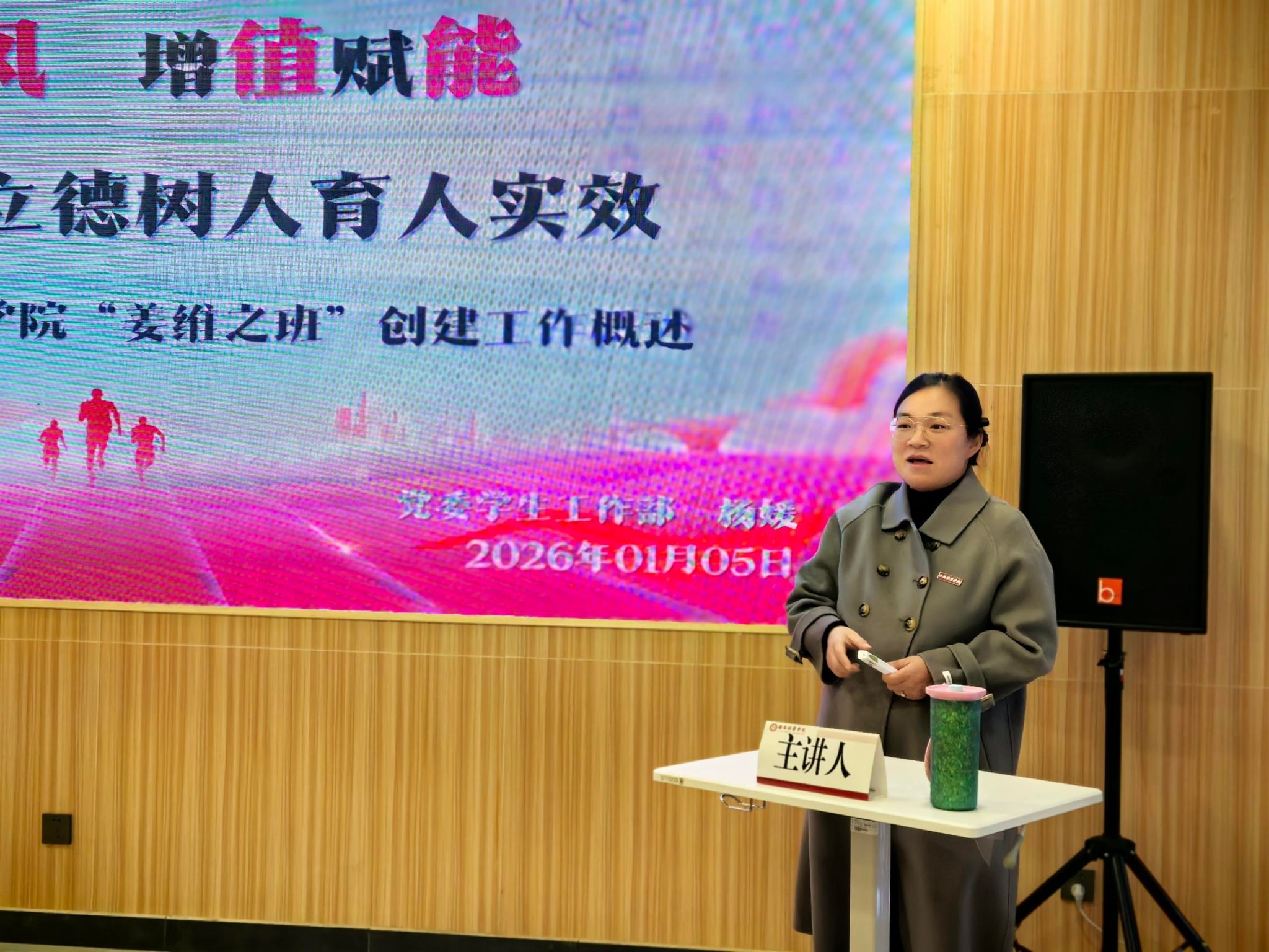 随后,党委学工部副部长杨媛通过“姜维之班”创建与班级建设为新入职辅导员开展专题讲座。讲座围绕创建意义、创建目标、创建流程及创建指标等核心内容展开全面解读,系统梳理工作要点,为新入职辅导员后续高效推进“姜维之班”创建及班级创建工作奠定坚实基础。