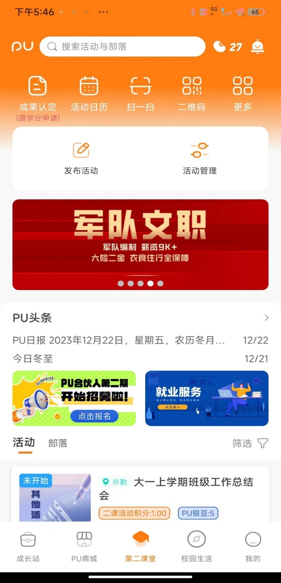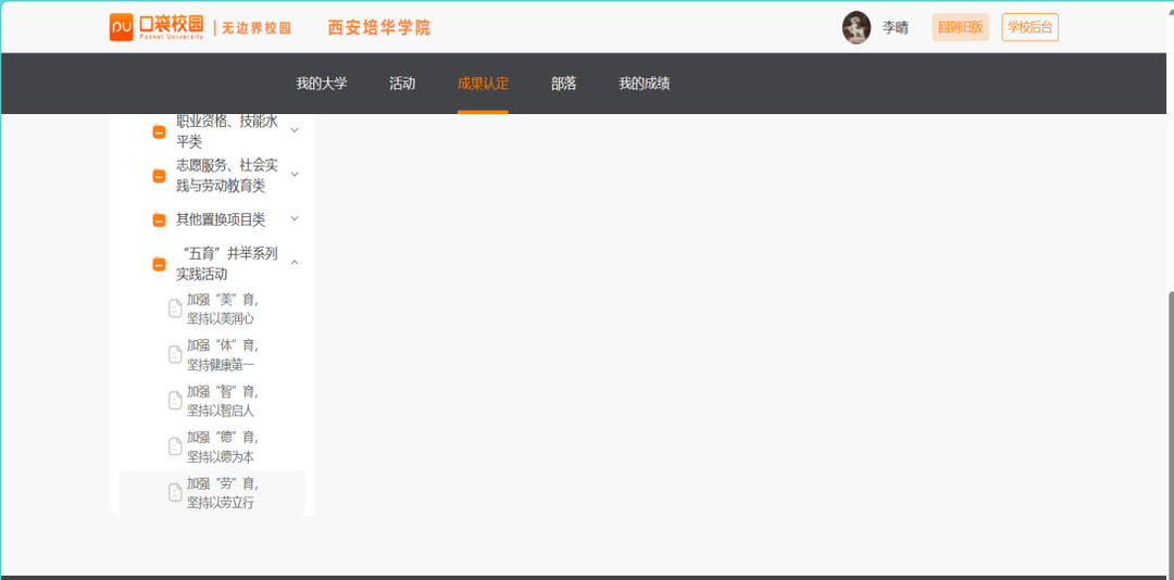 1.打开“PU口袋校园”APP,点击“成果认定”