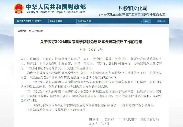 根据财政部、教育部、中国人民银行、金融监管总局《关于做好2024年国家助学贷款免息及本金延期偿还工作的通知》(以下简称《通知》)要求,国家开发银行将对本行承办的国家助学贷款(含生源地信用助学贷款和校园地助学贷款,下同)实行免息及本金延期偿还。现将具体事项公告如下: