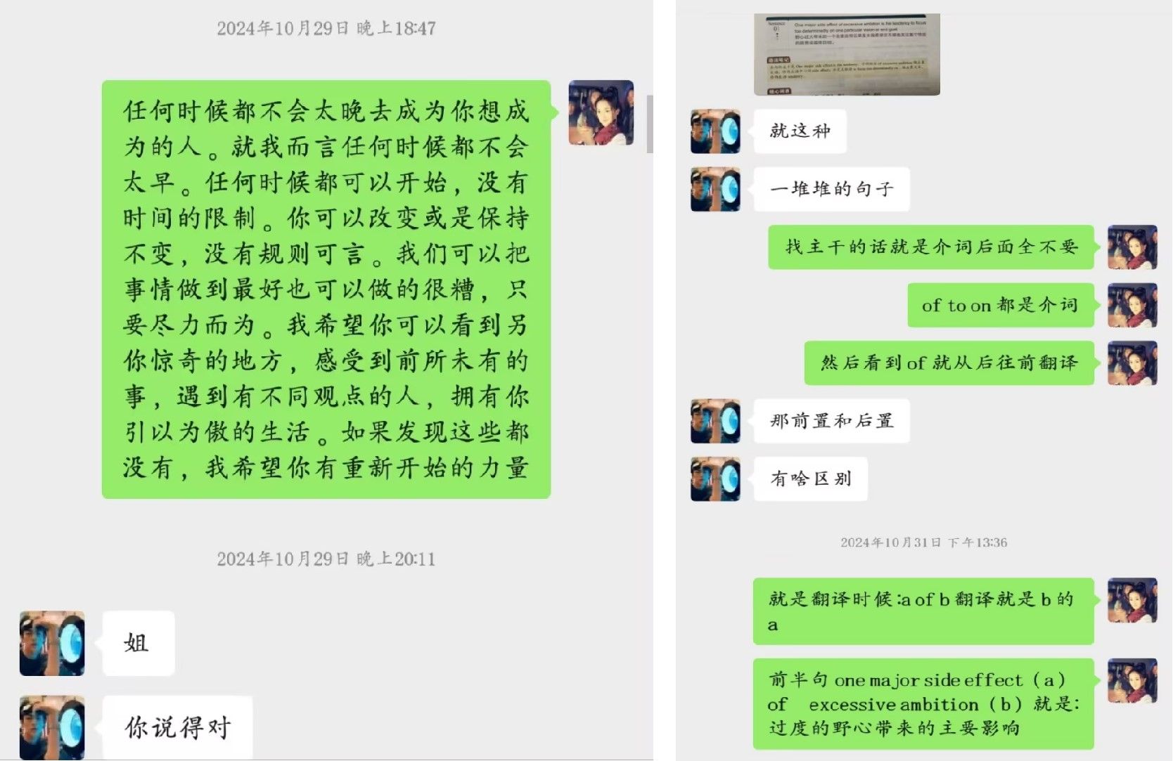 从被动监督到主动学习,从抵触英语到享受阅读,这个曾经彻底“摆烂”的学生,在秦佳宁的陪伴与引导下,完成了惊人的蜕变。如今,他不仅顺利通过了多门挂科课程的补考,更是在四级考试中考到407分,即便进入实习期,他依然保持着每日学习的习惯。这份双向奔赴的努力,不仅让他收获了知识,更重要的是,他彻底走出了自我否定的泥潭,重拾了面对未来的信心与勇气,实现了从“要我学”到“我要学”的根本转变。