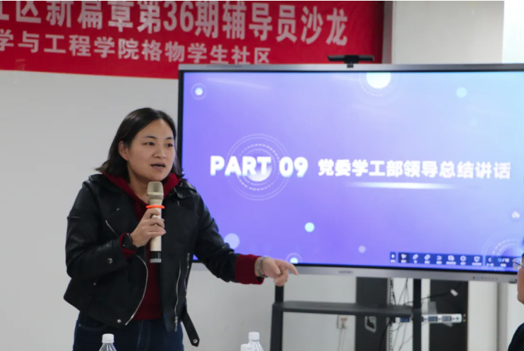 紧接着,格物学生社区9公寓楼长苏盼盼同学做分享,她提到,宿舍作为大学生在校的重要活动场所,通过各种各样的文化墙、社区活动、特色分享,在无形中形成了一种力量,给予了大学生新的成长路径与发展。苏盼盼同学结合自身工作实际,深入分享了社区育人活动的切身体会。并详细介绍了自己在社区所组织、参加的活动,以及在其中和同学们的收获与感悟。