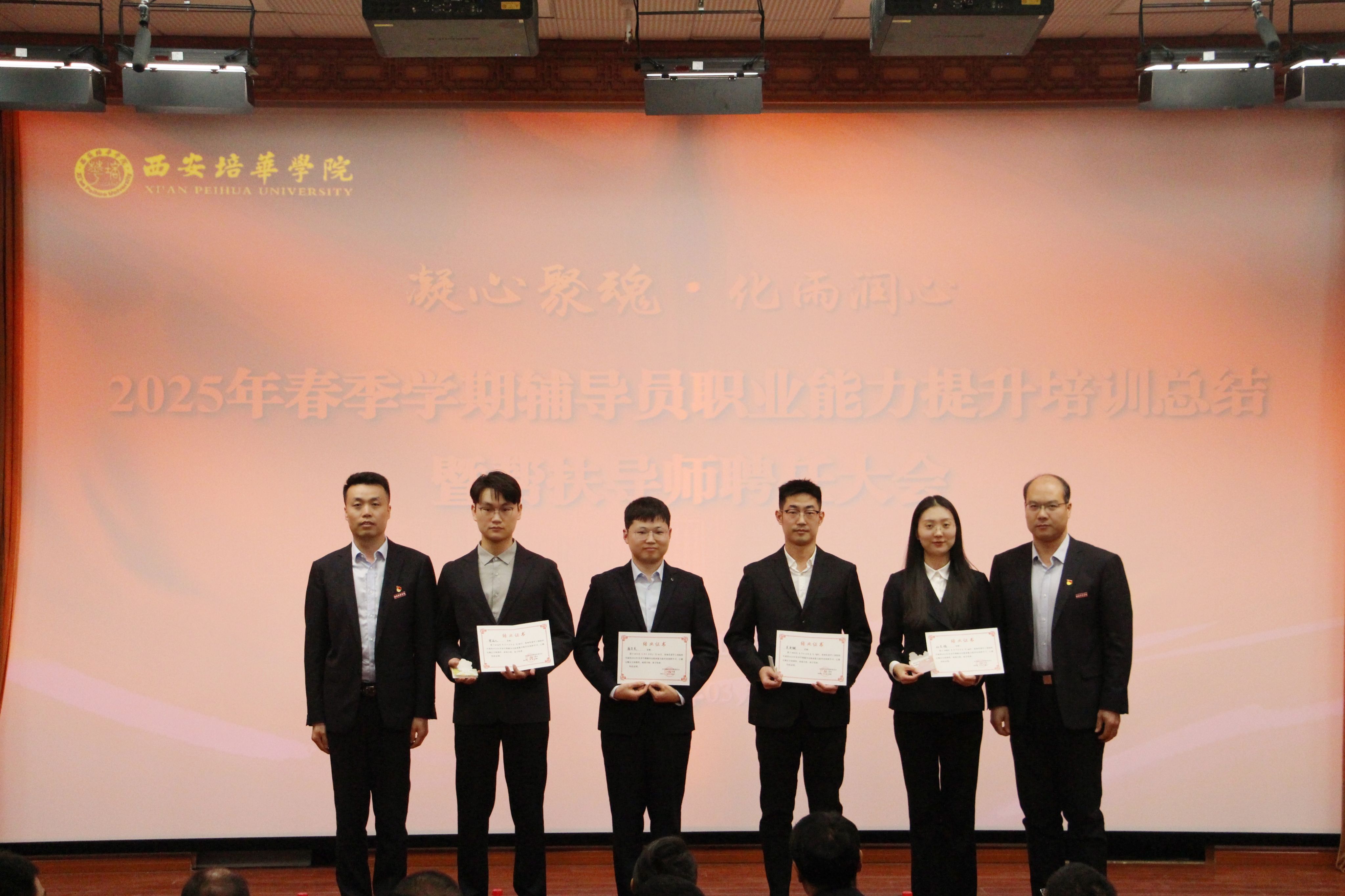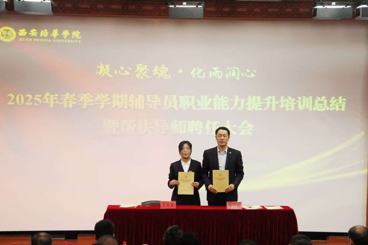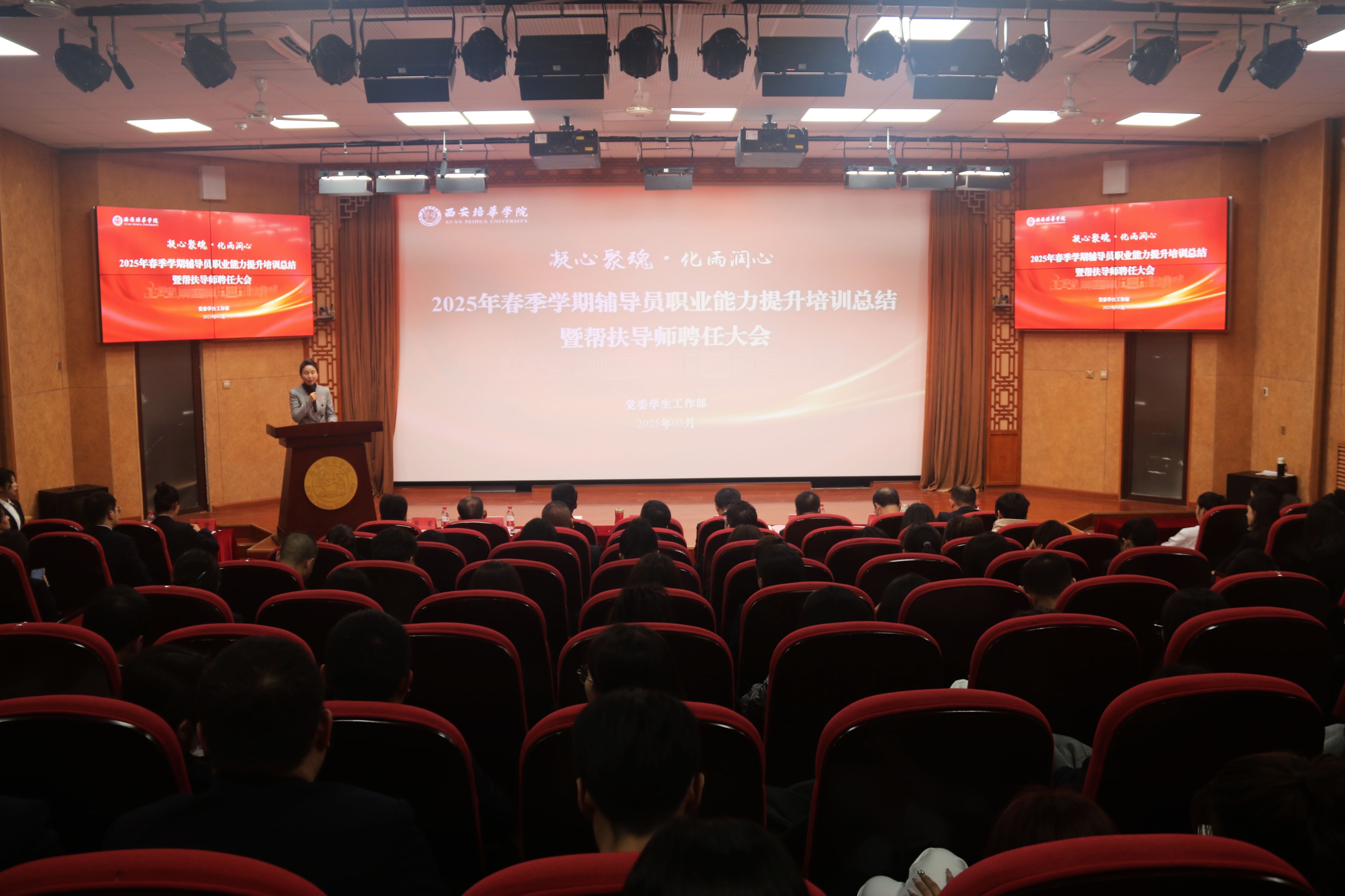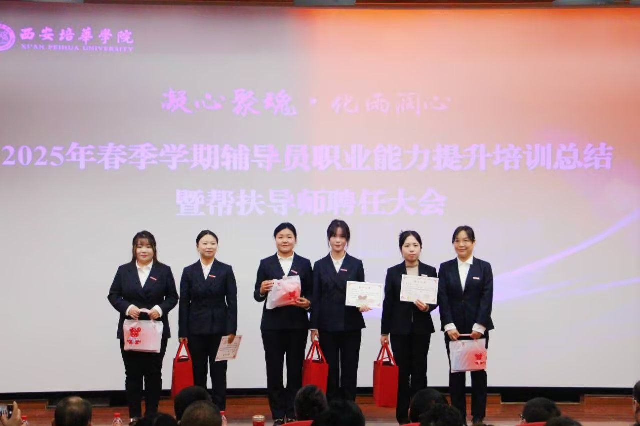 为进一步加强学校辅导员队伍建设,夯实新入职辅导员的业务培训和理论提升,促进新入职辅导员快速熟悉大学生思想政治教育政策、规律和方法,帮助新入职辅导员深入了解岗位职责和任务目标,3月14日,在汇知楼国学大讲堂举行了“西安培华学院 2025 年春季学期辅导员职业能力提升培训总结暨帮扶导师聘任大会”。我校党委副书记、副校长姚文静教授,党委学工部部长权勇太,副部长杨媛,校团委书记董莹,各二级学院党委(党总支)书记、副书记,全体辅导员参加了此次大会。大会由学工部副部长杨媛主持。