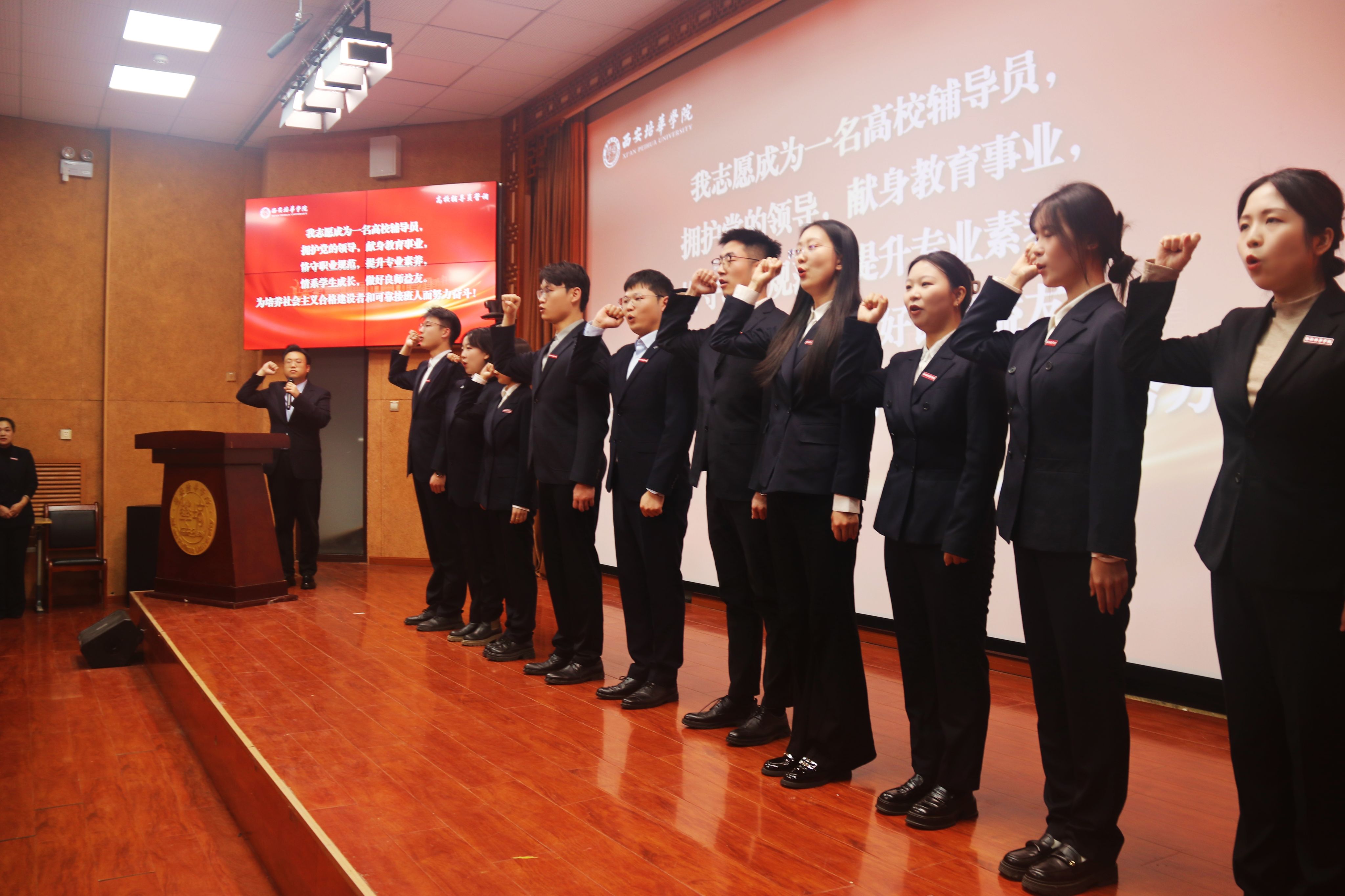 各二级学院书记为新入职辅导员颁发结业证书并赠送工作寄语纪念卡。帮扶导师为新入职辅导员佩戴了校徽并赠送了入职大礼包。同时,新入职的辅导员也为帮扶导师准备了一份心意,向导师赠送并行拜师礼。随后,医学院辅导员陈博威带领全体辅导员进行庄严宣誓。“我志愿成为一名高校辅导员,拥护党的领导……为培养社会主义合格建设者和可靠接班人而努力奋斗!”一字一句,神圣而豪迈,全体学工人也将牢记誓言,铭记嘱托,勤奋务实,开拓创新,为学校教育事业发展和学生成长成才贡献智慧与力量。
